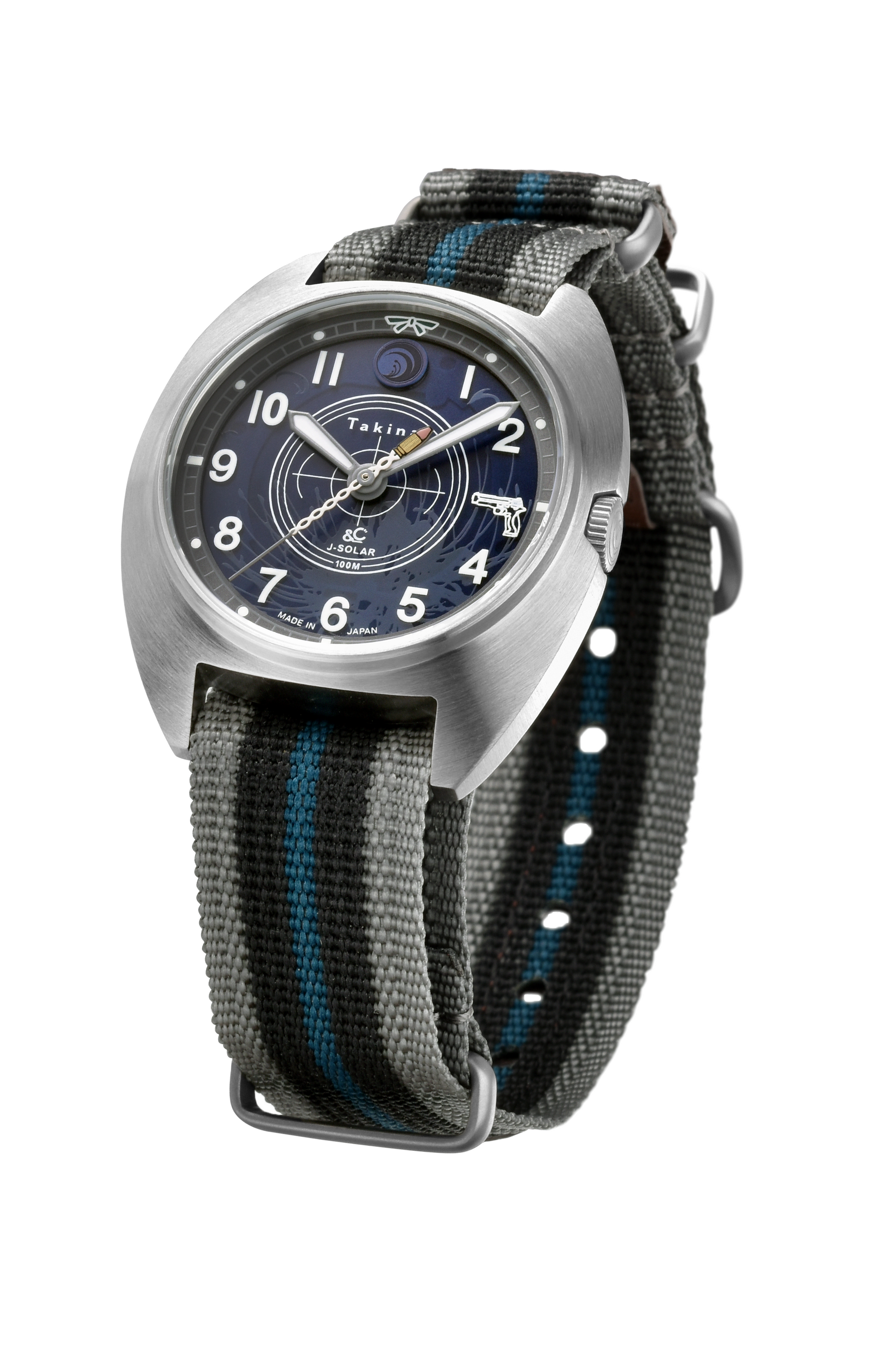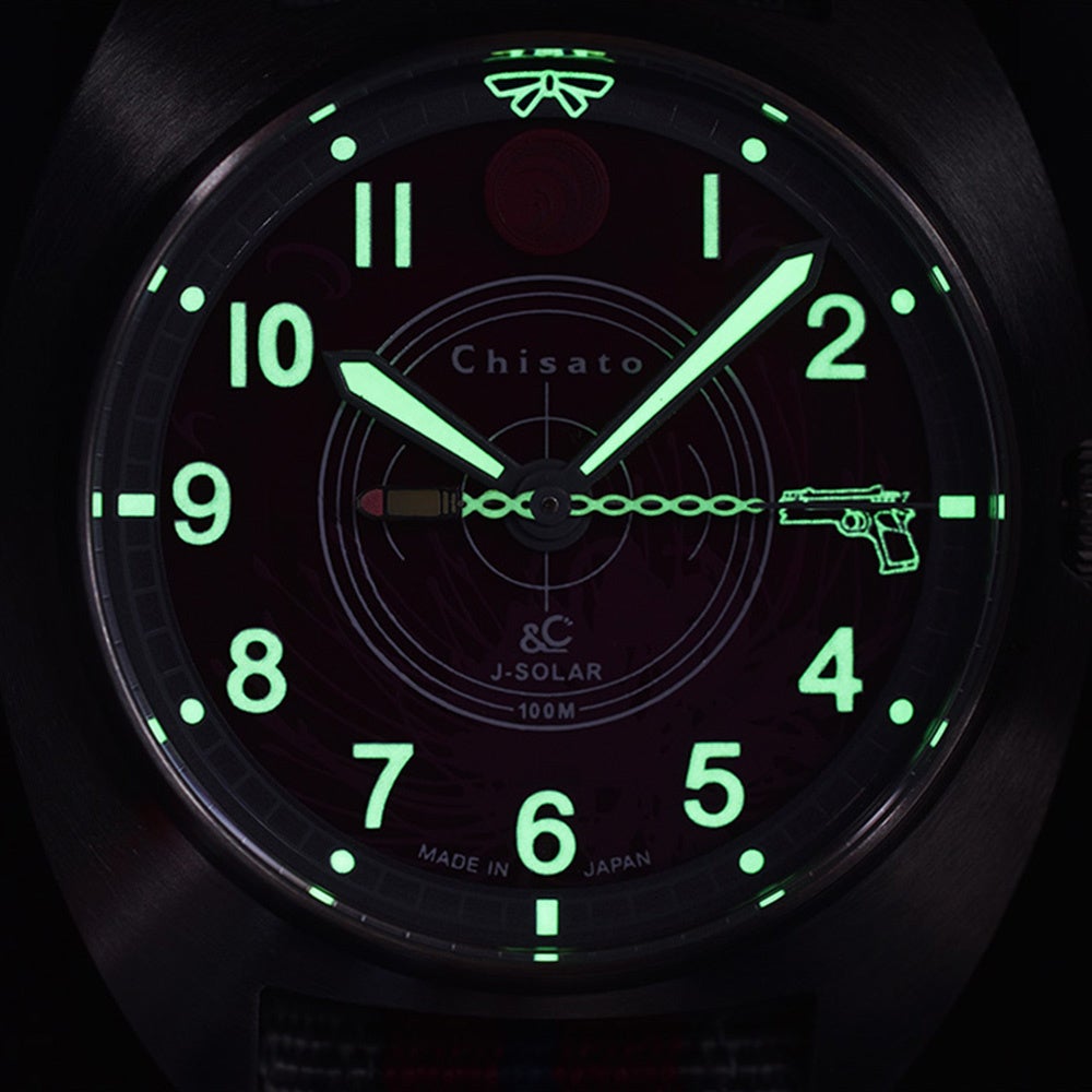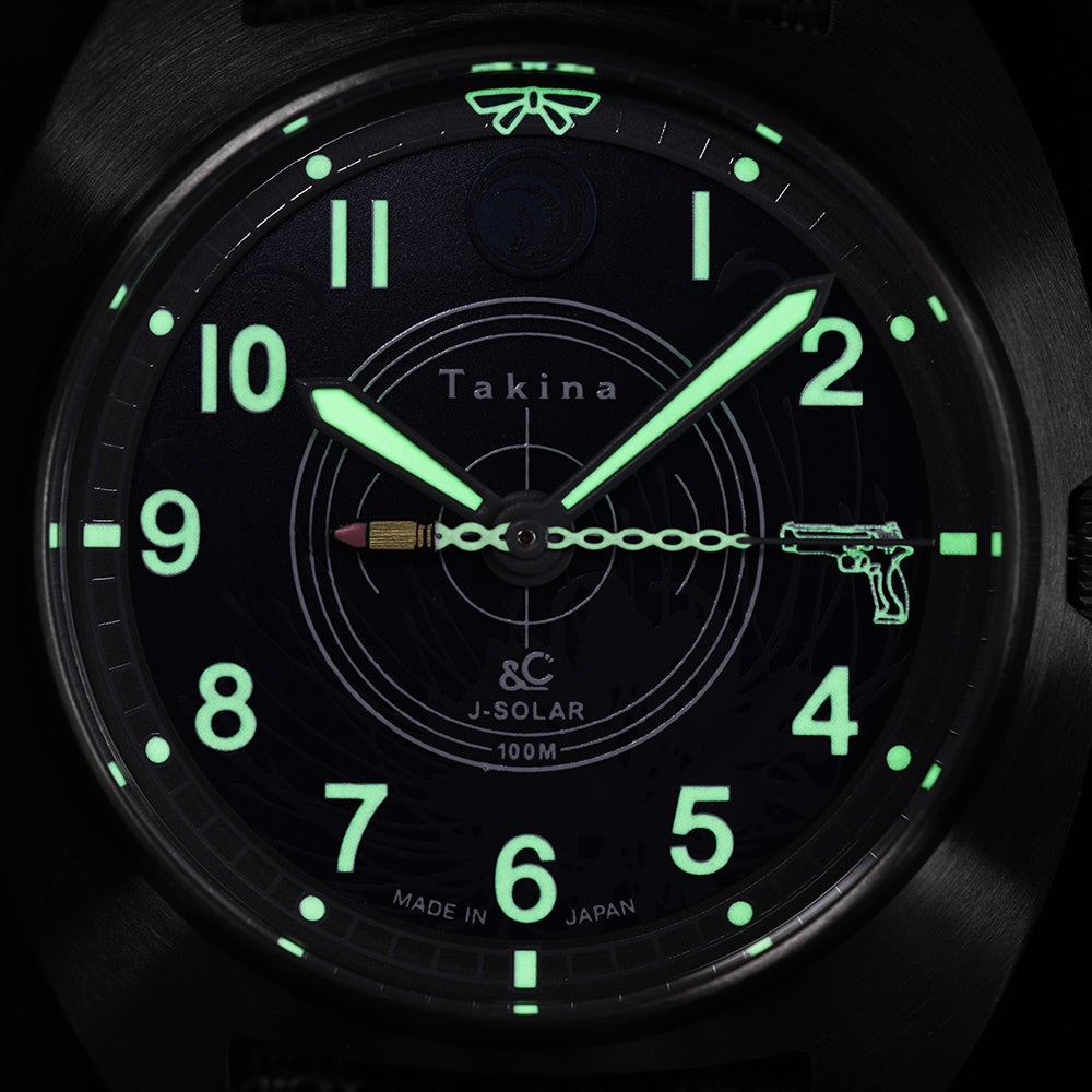 ムーブメントには、フル充電で最大4ヵ月駆動する日本製ソーラーモジュールを搭載し、電池交換が不要。強蓄光のインデックスと針は暗闇でも高い視認性を発揮し、さらに秒針が15秒を指すと、3時位置の銃口から放たれる弾丸の軌道が夜光で浮かび上がる特別なギミックを演出。高い実用性と遊び心を兼ね備えた、日常使いにもコレクションにも応える一本です。