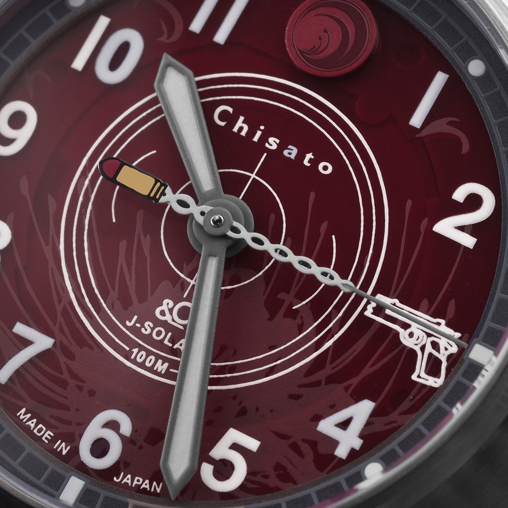 文字盤は、千束のキャラクターカラーをイメージしたレッドを採用。12時の位置にはリコリス校章、3時の位置には千束の銃のシルエットをデザイン。秒針は千束の非殺傷弾をイメージ。文字盤3時の位置にデザインされた、千束の銃シルエットと併せて楽しめるデザイン。裏蓋には、DAの刻印と共にChisatoの文字と限定300本生産のシリアルナンバーを刻印。