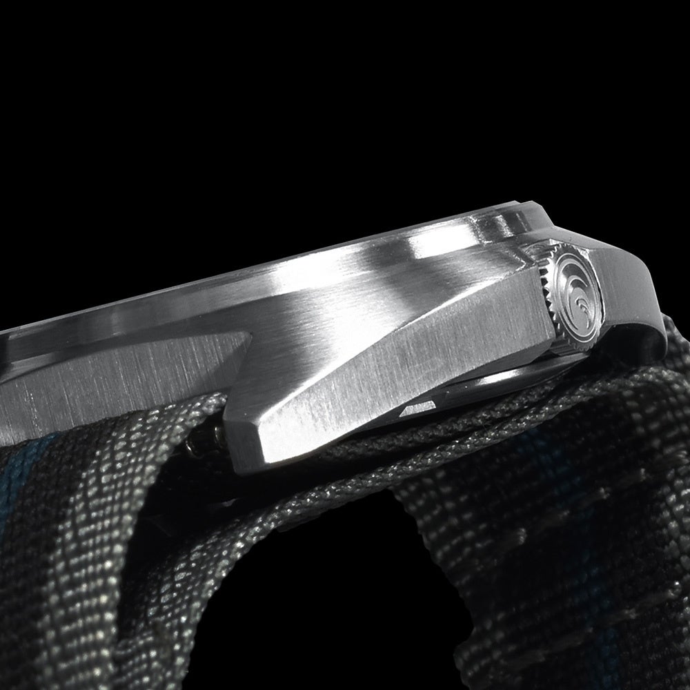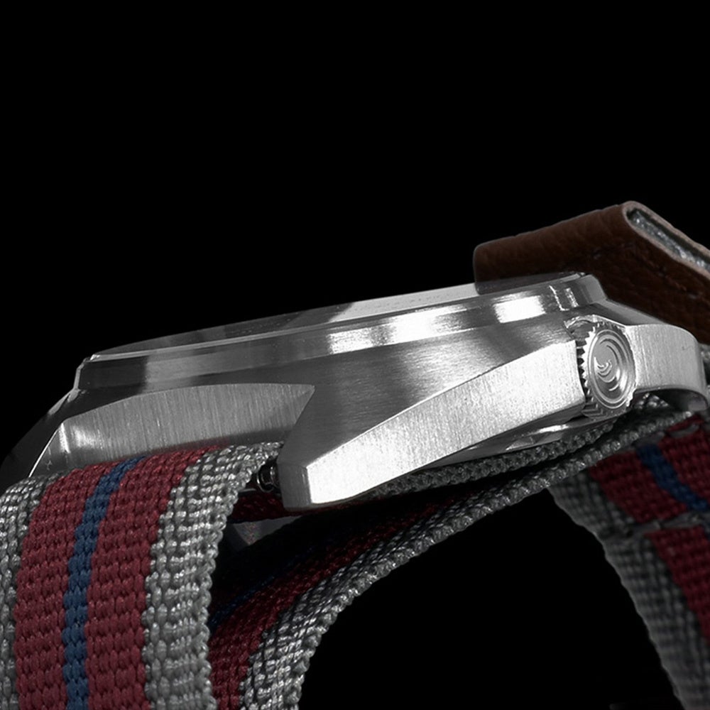 本モデルは、電池交換不要の日本製ソーラー駆動を搭載し、ミリタリーウォッチに欠かせない高い視認性と100M防水性能を兼ね備えています。リューズが手首に当たりにくいケース一体型設計や、NATOベルト穴のほつれを防ぐレザー補強など、日常からアウトドアまで実用性を重視した仕上がりです。