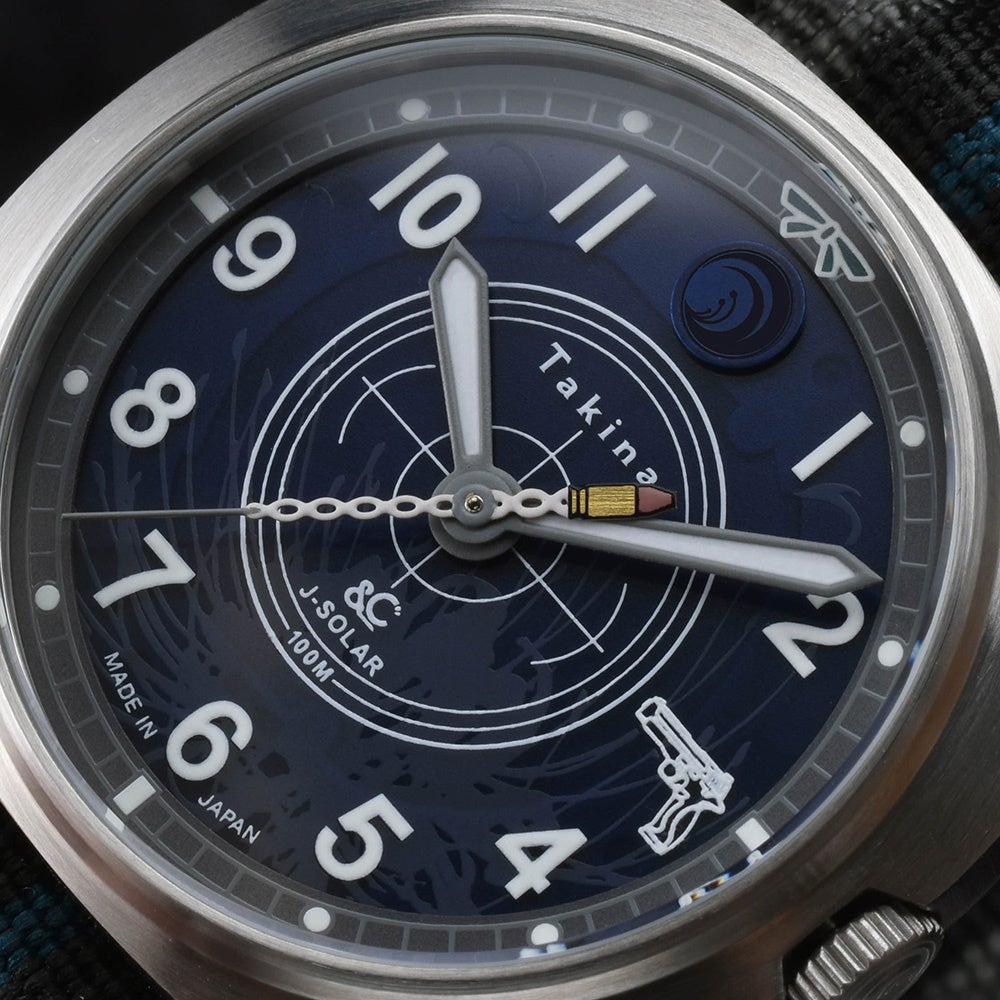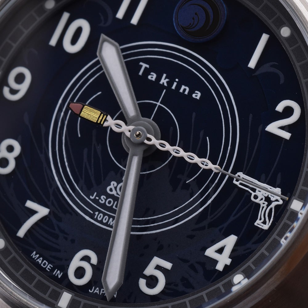 文字盤は、たきなのキャラクターカラーをイメージしたブルーを採用。12時の位置にはリコリス校章、3時の位置にはたきなの銃のシルエットをデザイン。秒針はたきなの弾丸を再現。文字盤3時の位置にデザインされた、たきなの銃シルエットと併せて楽しめるデザイン。裏蓋には、DAの刻印と共にTakinaの文字と限定300本生産のシリアルナンバーを刻印。