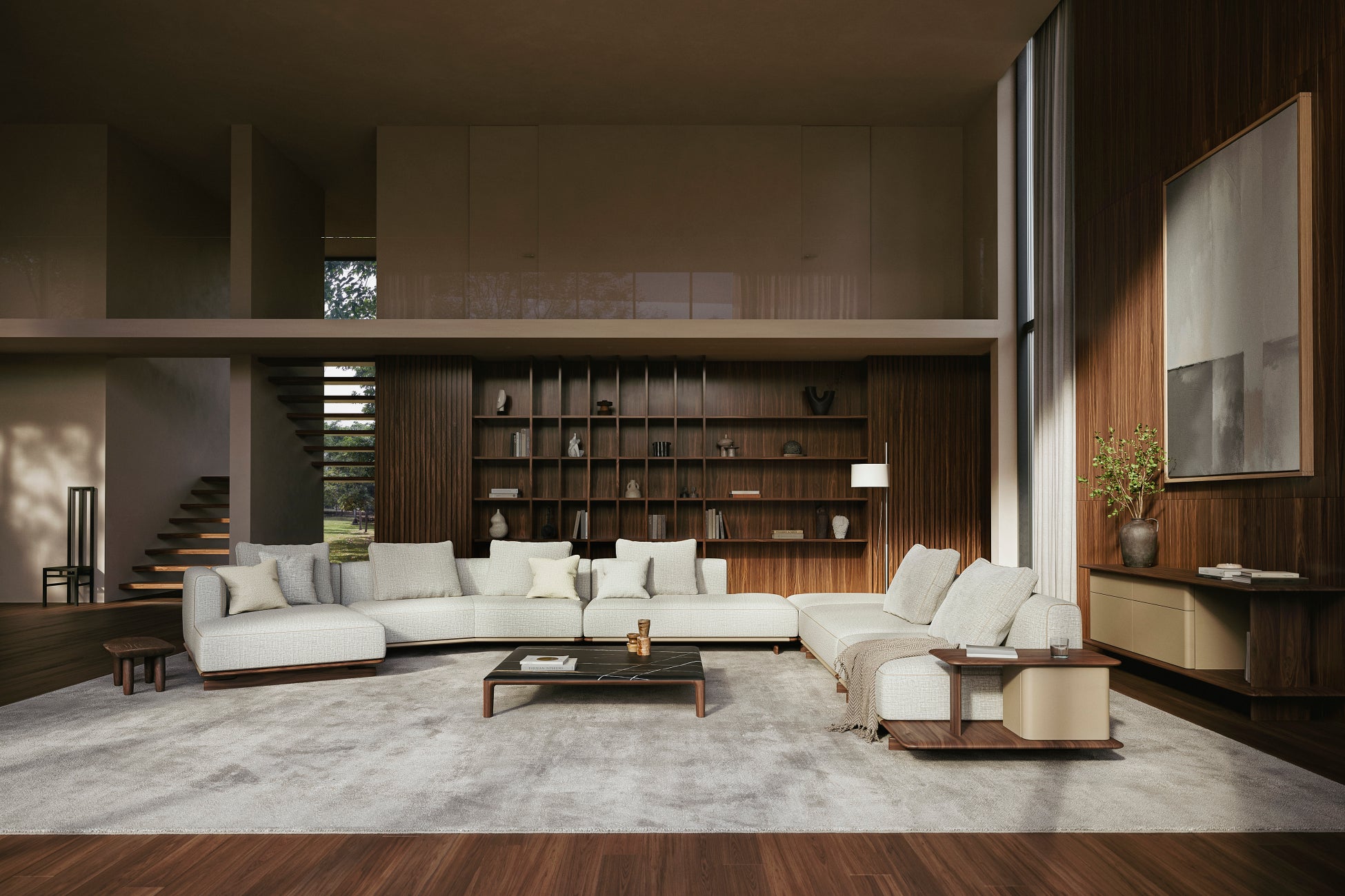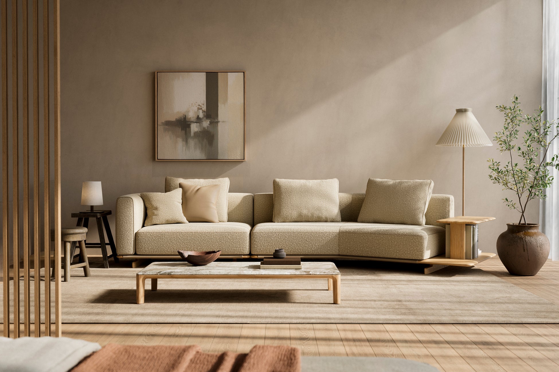 無垢材の脚とベースにレザーを組合わせた、洗練されたデザイン。木部のディテールは柔らかさの中にも繊細な表情を持ち、上質な佇まいを演出します。ベースパネルにはステッチ入りのレザーを巻きつけ、アルチザンによって生み出されたかのような美しいディテールが際立ちます。ソファ本体にはベースと同じ革のパイピングを施すことができ、よりエレガントでラグジュアリーな印象に。「PLATO(プラトー)」という名前は、フランス語の“PLATEAU”(台地)に由来します。まるで宙に浮かぶ大地のようなベースパネルにさまざまなユニットを組み合わせることで、リビングに広がる開放的な空間を生み出します。