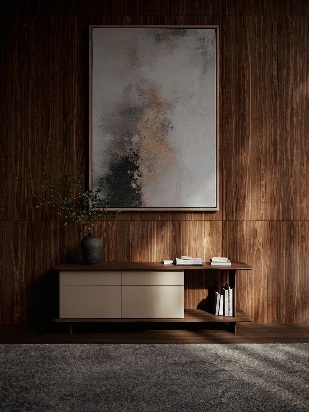 無垢材とレザーを組み合わせたキャビネット。ボディには上質なレザーが張られ、木の温もりと素材のコントラストが美しく調和します。さらに、ボディの横に設けられた抜けのあるデザインが、視覚的な軽やかさとキャビネットとしての機能性を高めています。