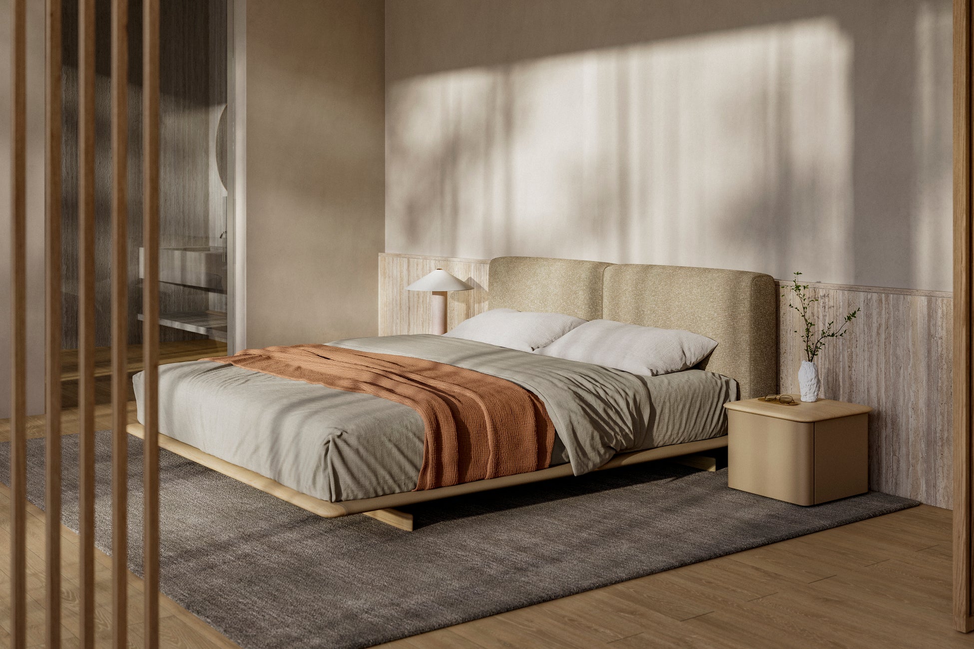 ソファと同じ無垢材のベースパネルを使用し、その上にマットレスを乗せたデザインのベッド。マットレスからベースパネルを大きくせり出させることで、より浮遊感を強調した印象的なデザインです。サイズはキングとクイーンの2サイズ展開。ベッドサイドキャビネットは、収納力のある大きな1段ドロワーを備え、さらに上段にはインナードロワーを内蔵しています。ベッドサイドで使う小物をすっきりと収納できる、使い勝手のよい仕様が魅力です。