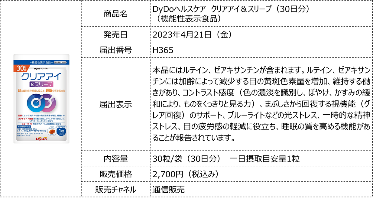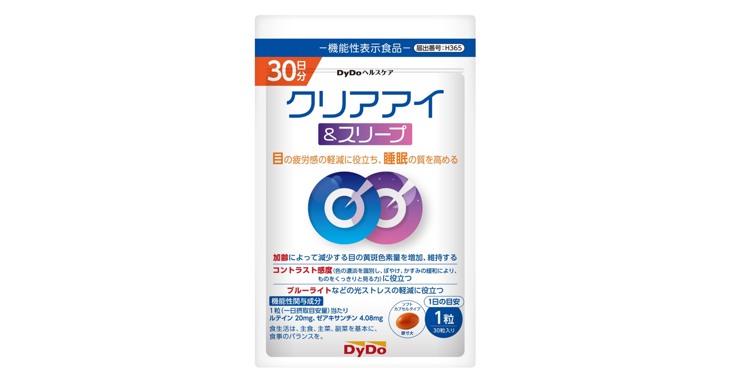 ダイドードリンコ株式会社は、「DyDoヘルスケア」シリーズの新商品として、機能性表示食品「DyDoヘルスケア クリアアイ&スリープ(30日分)」を4月21日(金)より発売いたします。