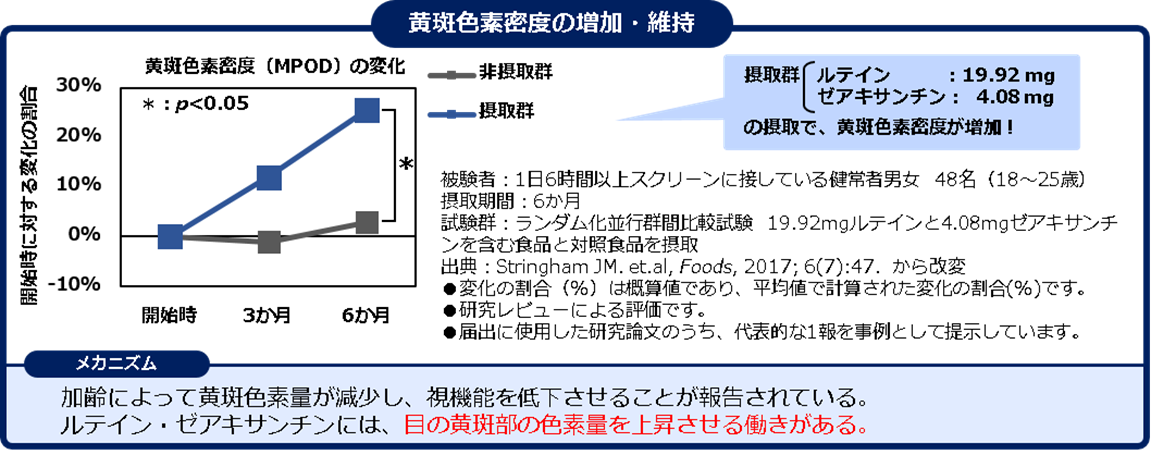 黄斑色素は網膜の黄斑部にルテインとゼアキサンチンが蓄積して形成しています。しかしながら、加齢とともに黄斑色素密度が減少していくことで、ブルーライトの影響をより受けやすくなります。黄斑色素密度の増加には、ルテイン・ゼアキサンチンを摂取することが一番効果的であると考えられます。