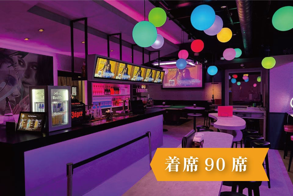 ワンランク上の空間を楽しむことをができるASOBIBARは、着席90席と広々とご利用頂けます。