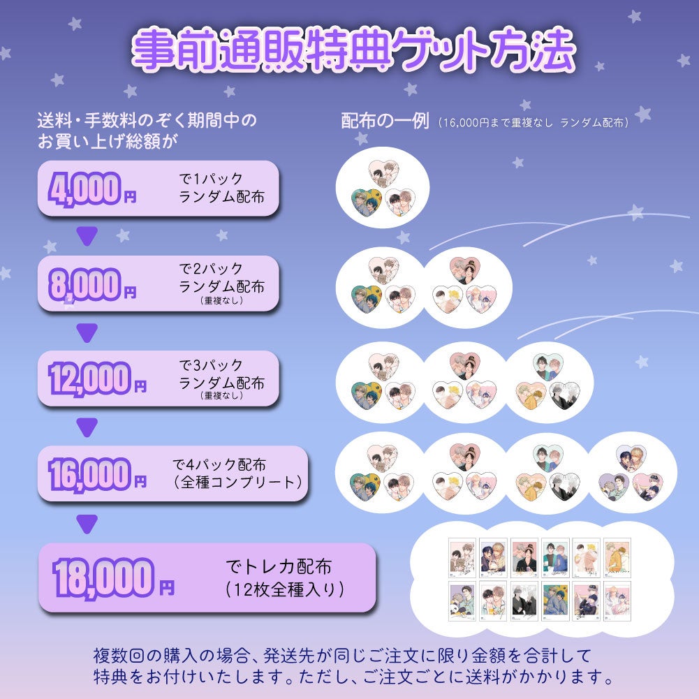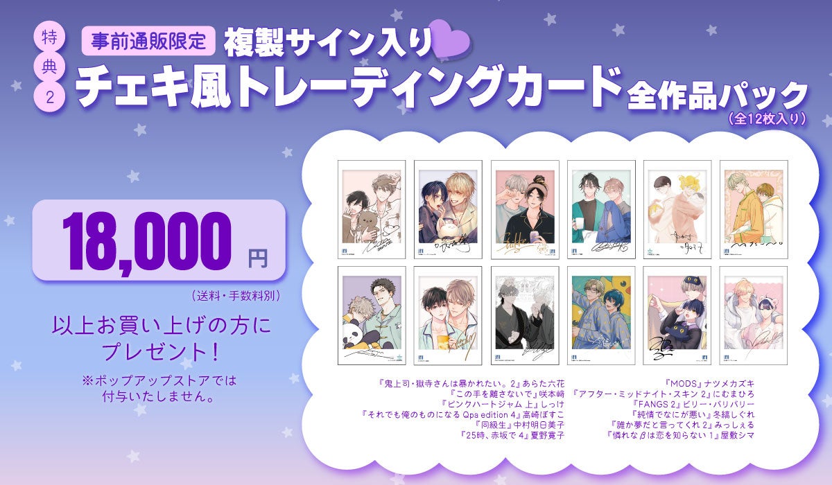 また、18,000円ごとに(送料、コンビニ支払い手数料、その他手数料など別)全12作品分を封入した複製サイン付きチェキ風トレーディングカードパックを1つお付けします。