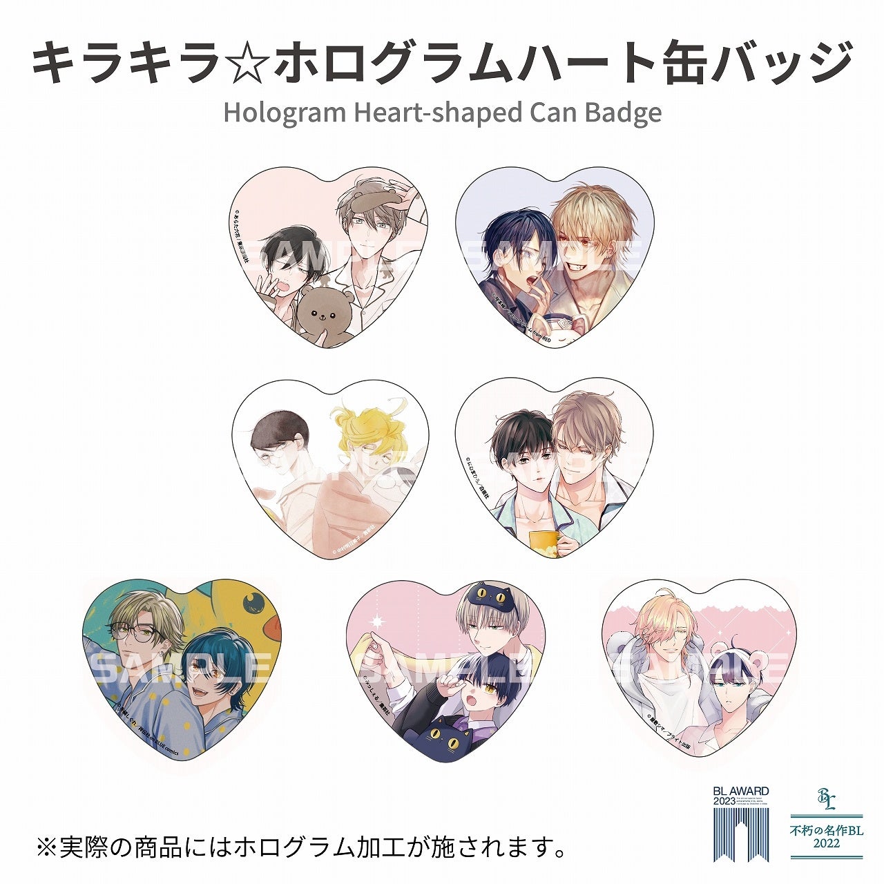 BLアワード2023&不朽の名作BL2022を記念した缶バッジです。ホログラムつきできらきら光るハート型の特別仕様でのご用意です♥