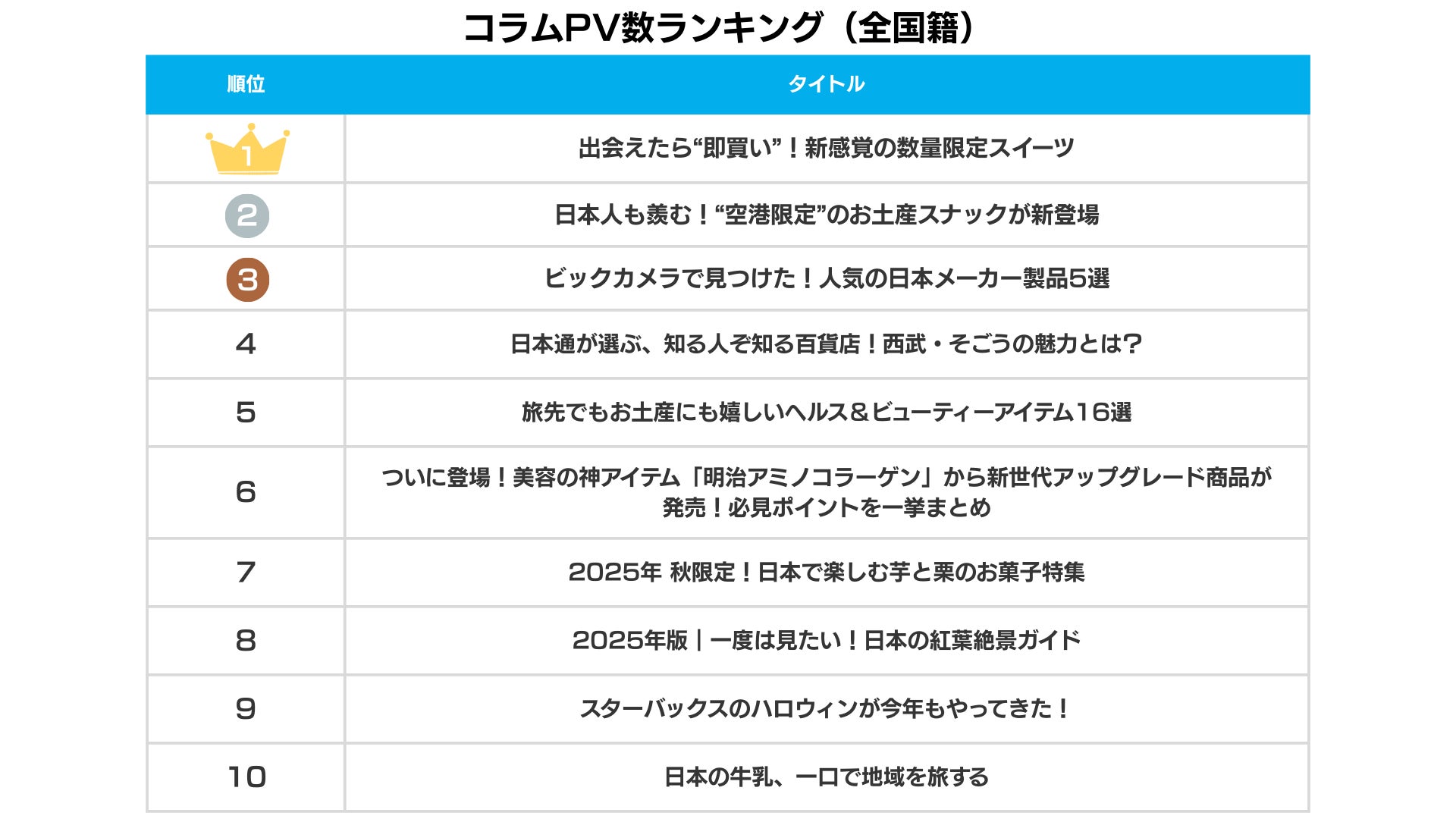 「日本でしか買えない」「地域限定」という希少性が、旅ナカでの特別な体験を求める訪日客の関心を集めたと考えられます。また、老舗ブランド「明治」が挑む新感覚スイーツという話題性も、多くのユーザーが記事を閲覧する動機になったのではないでしょうか。