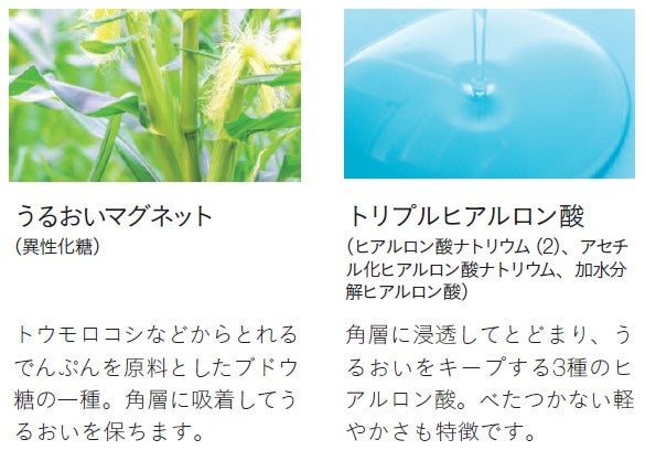 角層の表面に吸着してみずみずしい状態をキープする成分・うるおいマグネットと、角層に浸透してうるおいを守る3種のヒアルロン酸を配合。