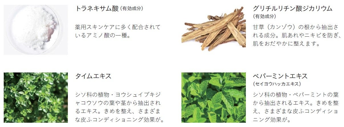 トラネキサム酸とグリチルリチン酸ジカリウムという、肌あれを防ぐ有効成分をダブルで配合。
