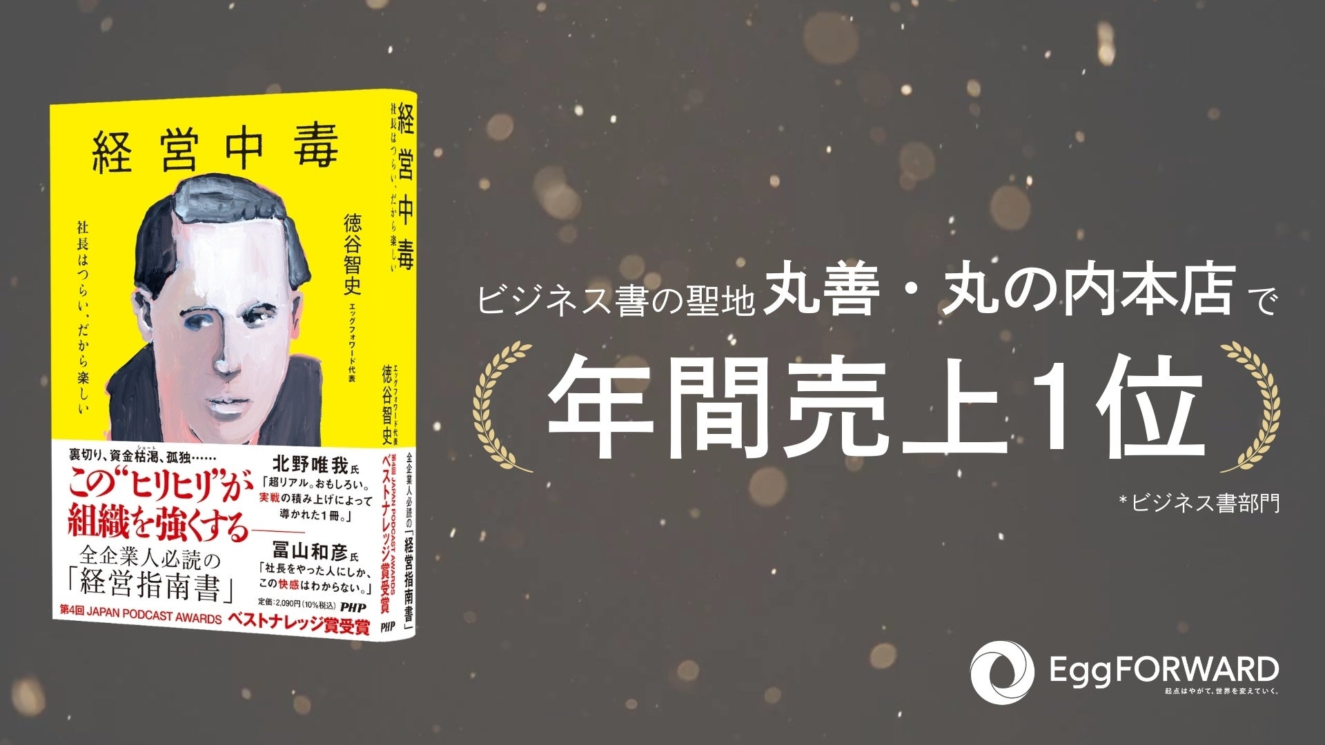 経営組織コンサルティング/VC事業及びHRプラットフォーム事業を手がけるエッグフォワード株式会社(本社:東京都渋谷区)代表・徳谷智史の著書『経営中毒ー社長はつらい、だから楽しい』(PHP研究所)が、丸善・丸の内本店(東京都千代田区)のビジネス書部門の年間売上1位を記録したことをお知らせします。