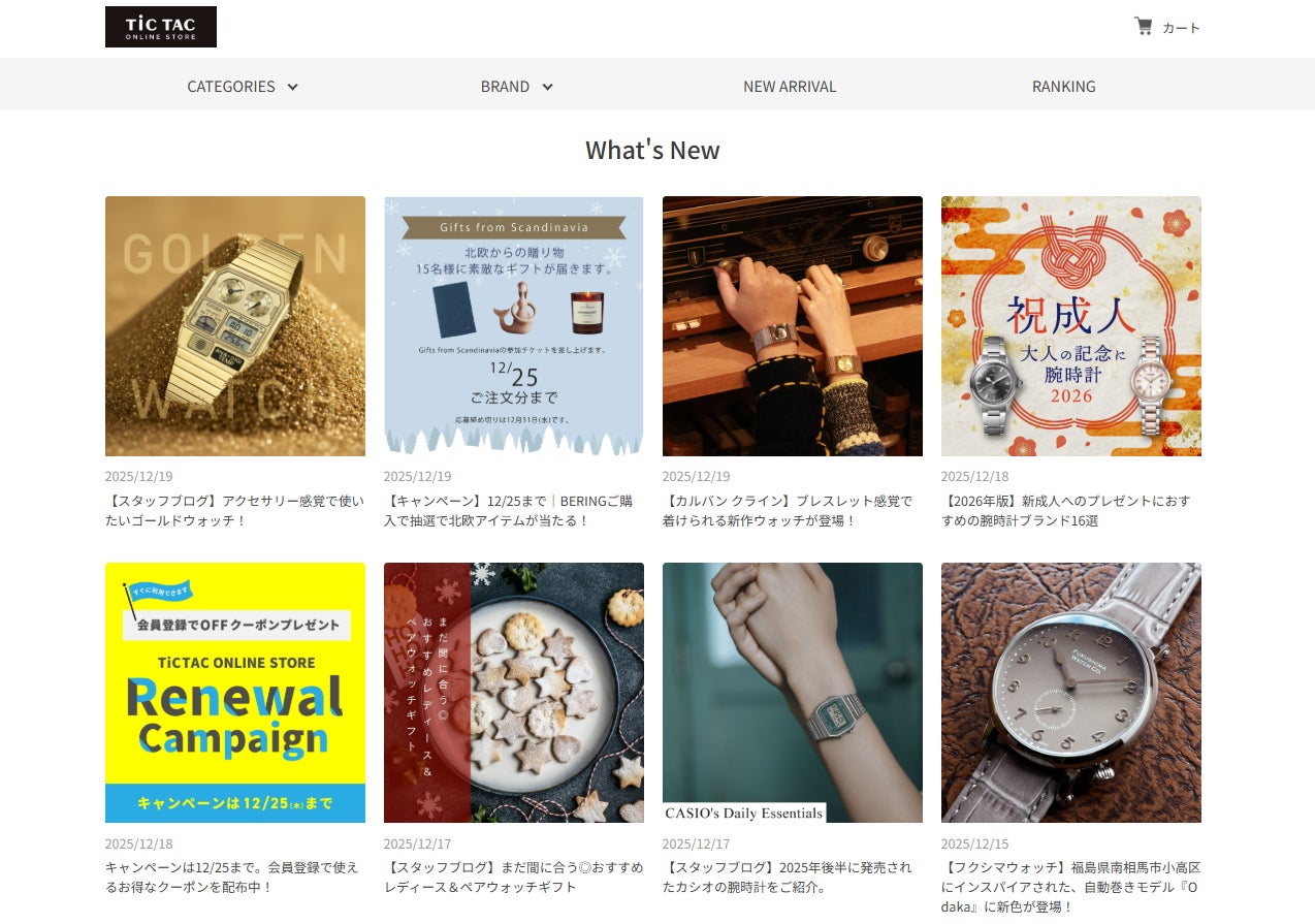 株式会社メルカート(本社:東京都港区、代表取締役社長:渡邉 章公/以下、メルカート)は、株式会社ヌーヴ・エイ(本社:東京都港区、代表取締役社長:田代 寛/以下、ヌーヴ・エイ)が運営する腕時計専門店「チックタック(TiCTAC)」のECサイトを、クラウドEC構築プラットフォーム「メルカート」にてリニューアルオープンしたことをお知らせします。本リニューアルでは、これまでのEC運用で蓄積されたカスタマイズや機能構成を見直し、標準機能を前提としたシンプルな設計へ再構築。運用負荷を抑えながら、今後の改善や拡張にも柔軟に対応できるEC基盤を実現しました。ECの複雑化に悩む中堅・大手企業にとって、再現性の高いECリニューアル事例となっています。