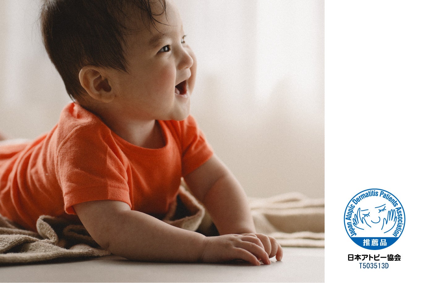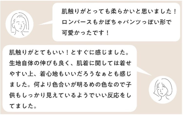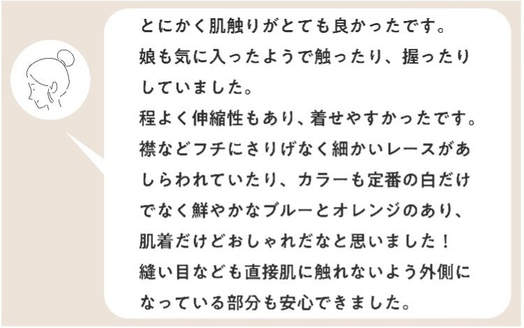 肌着の素材には、綿100%でウールのようなやわらかさ・暖かさ・軽さを持った素材「スマイルコットン®︎」(スマイルコットン社)を採用。糸の撚を戻して作る、ふんわり軽い肌触りの綿素材で肌への刺激を低減しました。今回のベビー肌着は全て日本アトピー協会推薦品として認められています。