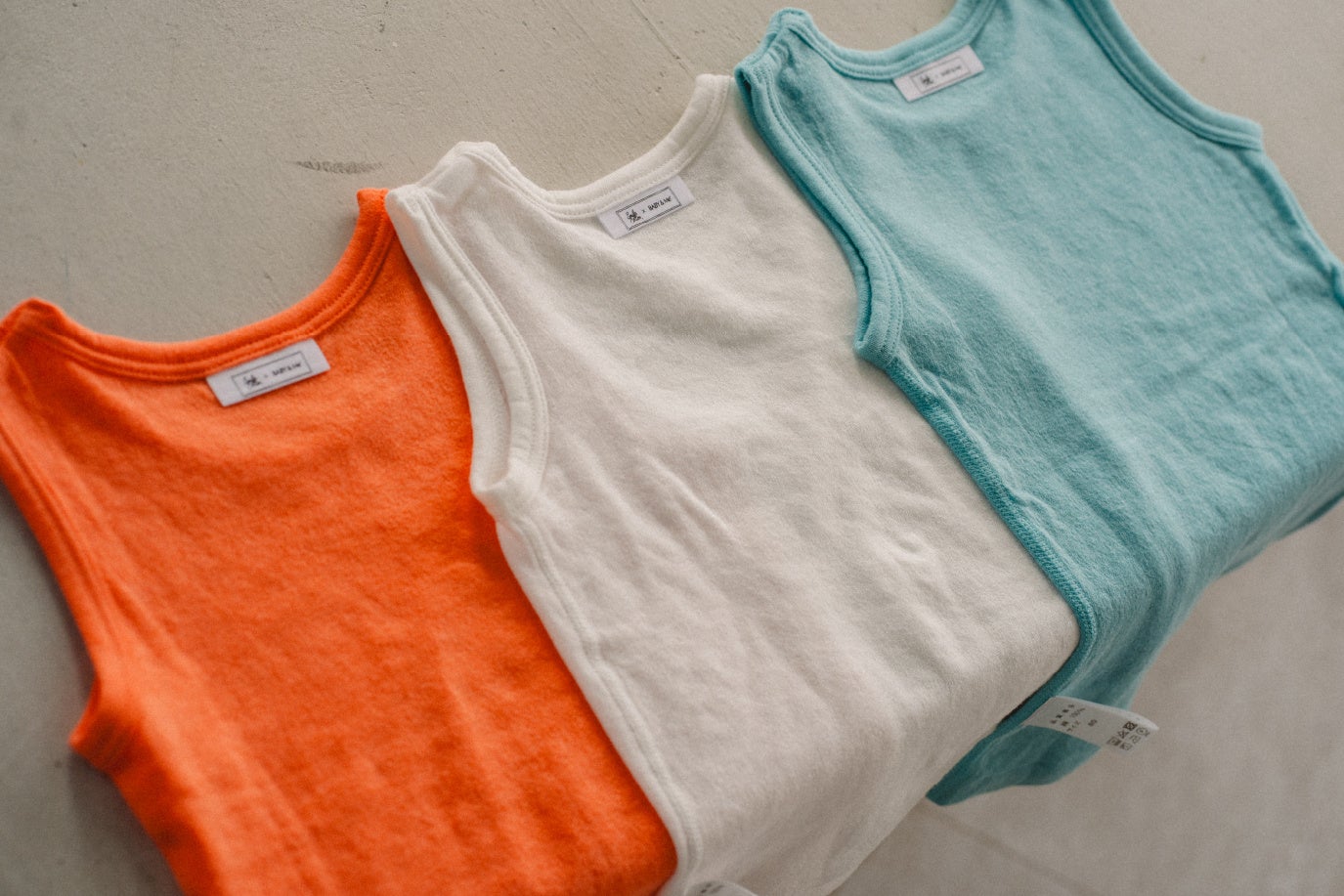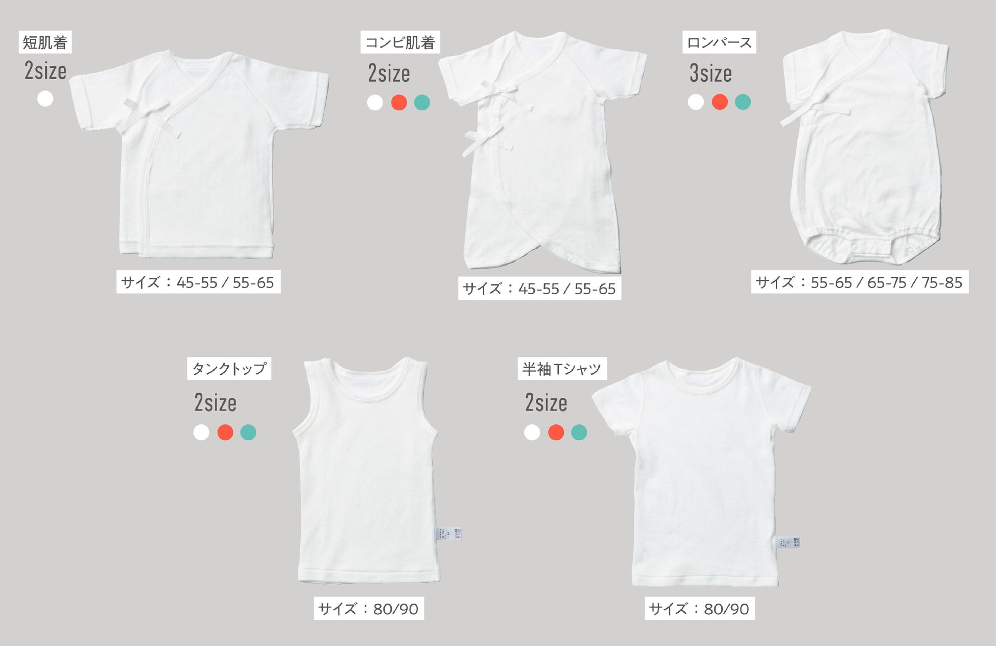 ※コンビ肌着・ロンパースはそれぞれ、ホワイト / オレンジ / ミントの3色からお選びいただけます