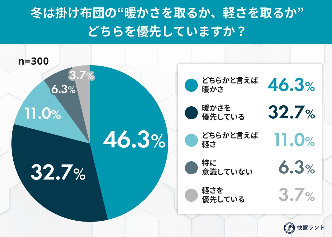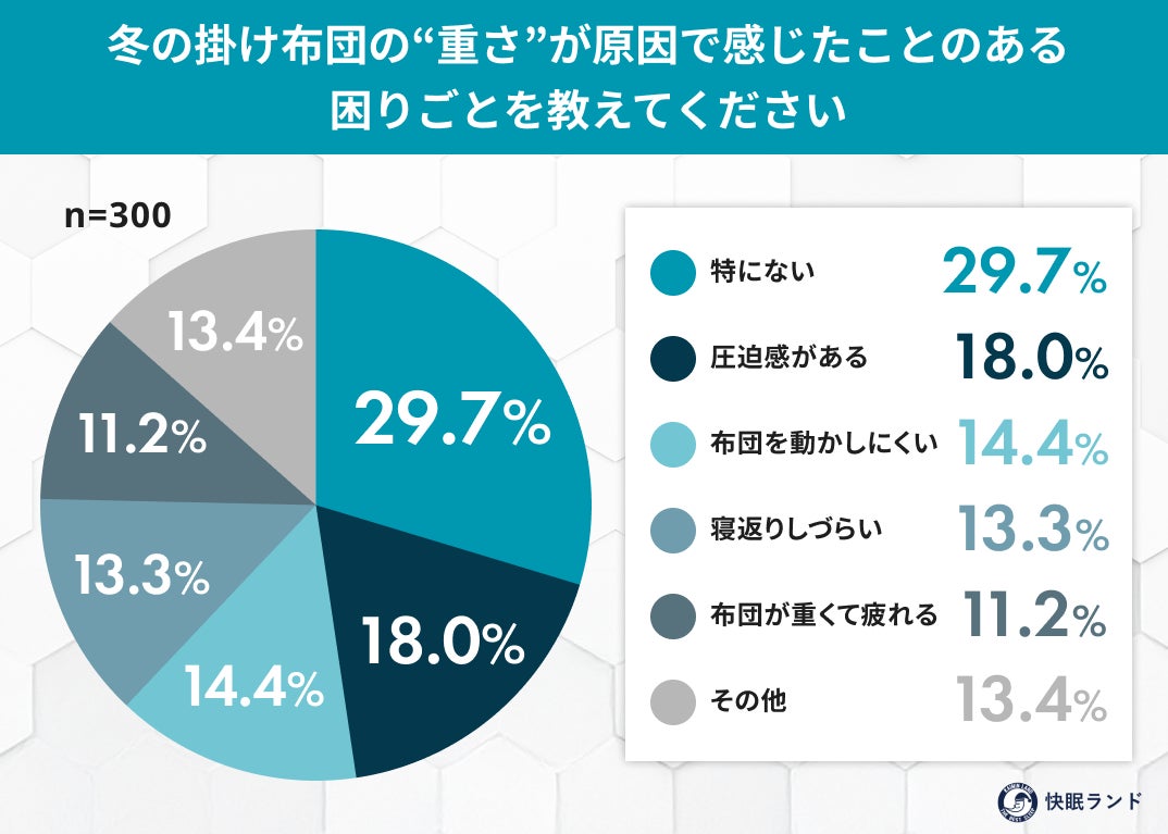 寒さが厳しくなる冬は、掛け布団に「暖かさ」を求める人が多い一方で、「重さ」が睡眠の質に影響している可能性も指摘されています。快眠グッズ紹介サイト「快眠ランド」を運営するムーンムーン株式会社は、全国の掛け布団を使用している一般男女300名を対象に、「冬の掛け布団の重さと寝心地」に関する調査を実施しました。調査の結果、約8割が冬の掛け布団選びで「暖かさ」を優先している一方、約7割が掛け布団の重さによる何らかの困りごとを経験していることが明らかになりました。暖かさを求めるほどに生じやすい“重さの影響”という、冬の睡眠環境に潜む課題が浮き彫りとなっています。