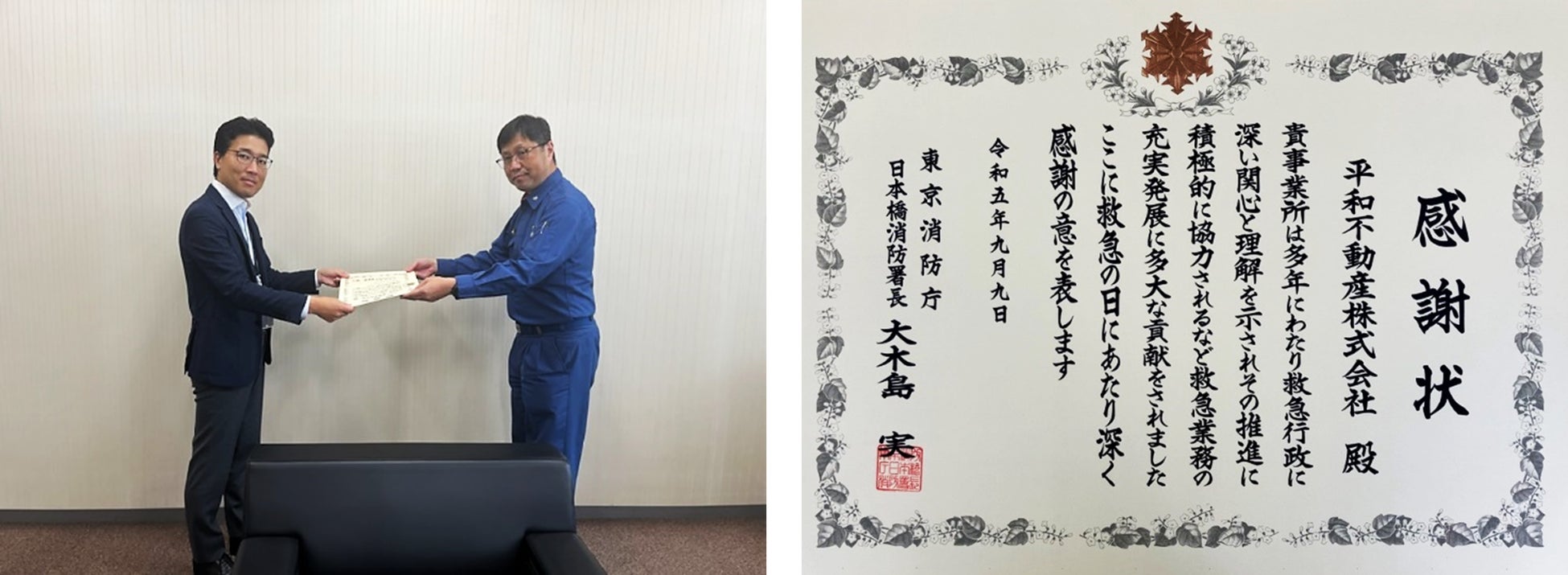 平和不動産株式会社(代表執行役社長:土本清幸)は、「救急行政に深い関心と理解を示し救急業務の充実発展に多大な貢献をした」として、東京消防庁日本橋消防署長より感謝状を賜りましたので、お知らせいたします。