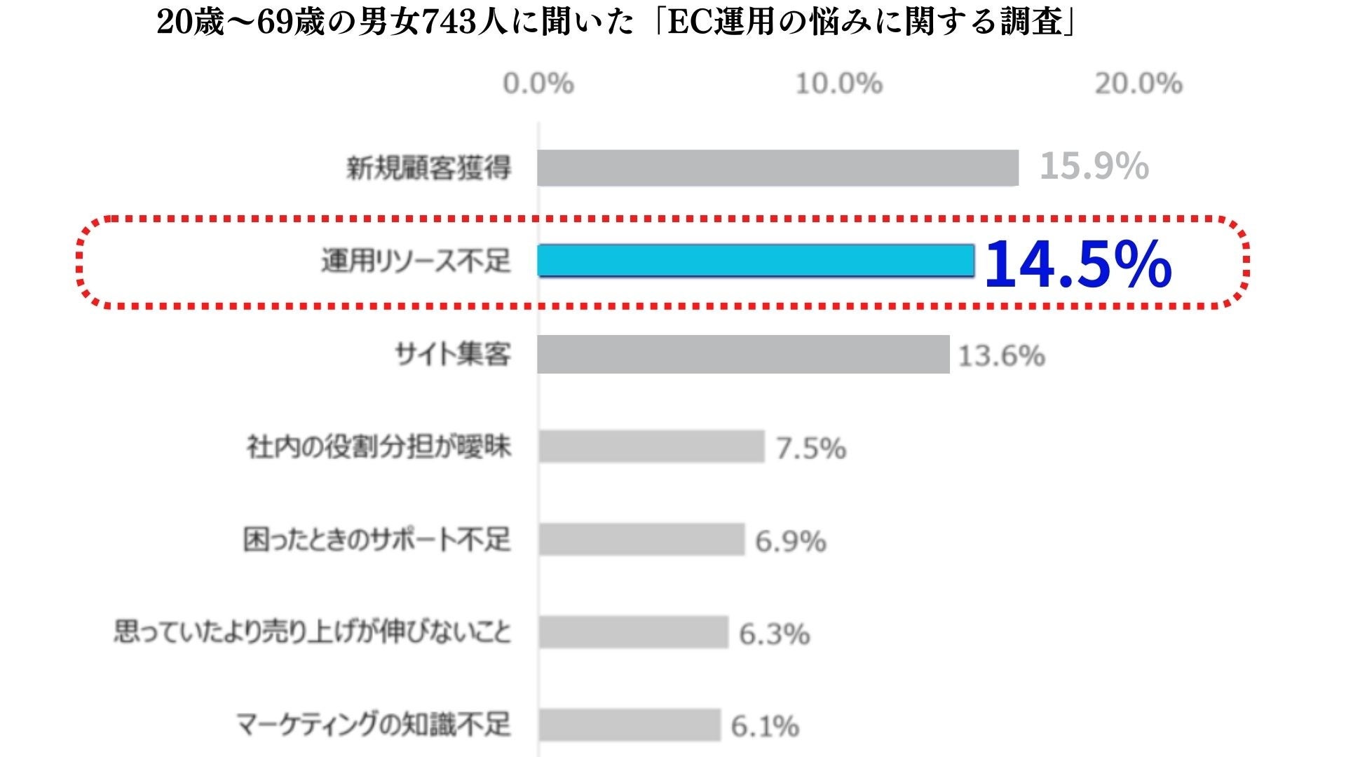 ECサイトの市場拡大により、知識・スキルが必要なEC運用人材の需要が高くなっております。また下記の図のように人材投資に積極的な大手EC店舗以外は、EC運用人材の採用が難しくリソース不足が続いているのが現状です。