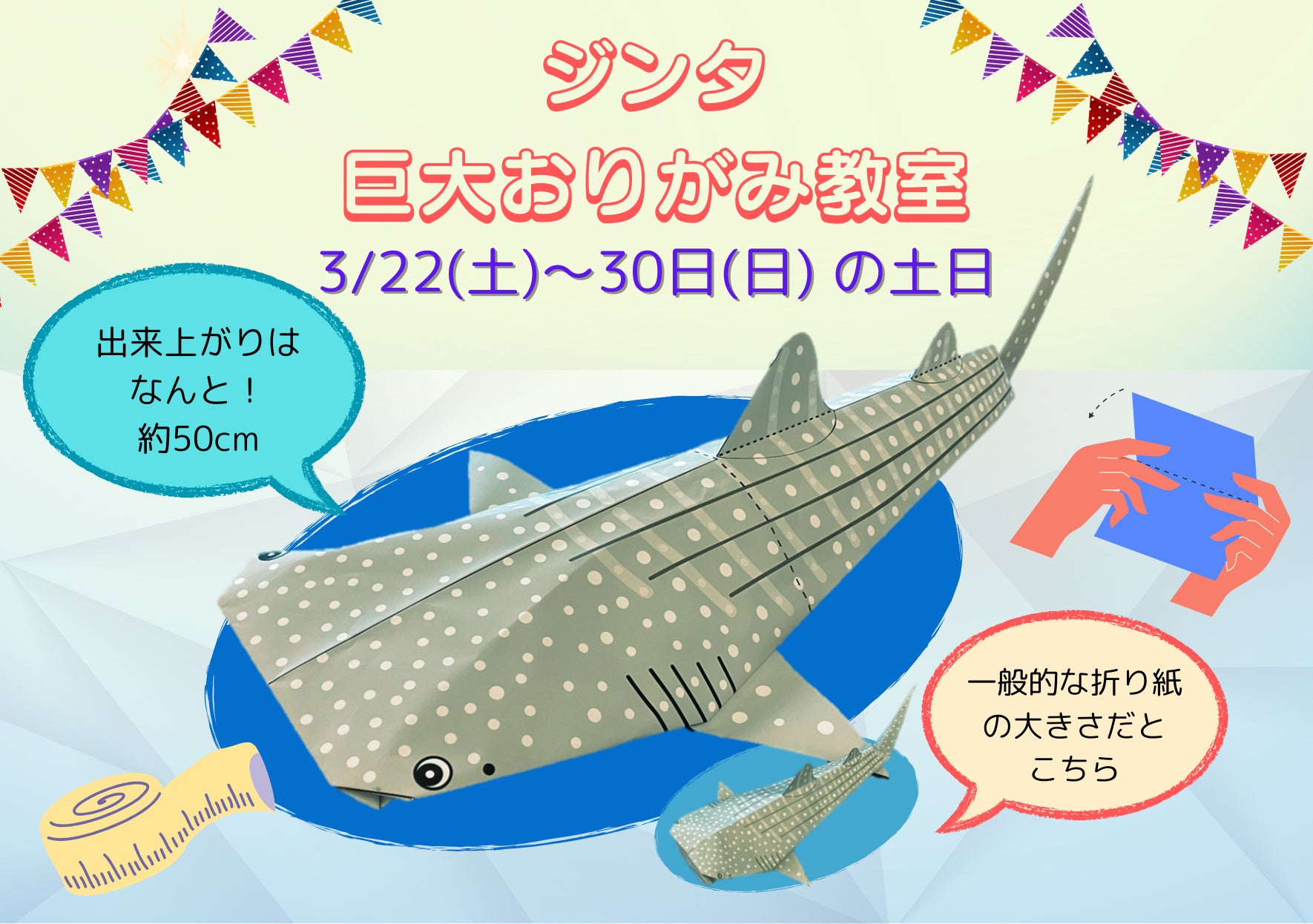 なんと出来上がりは、約50cm!! 巨大折り紙でジンベエザメ「ジンタ」を作ってみませんか? |