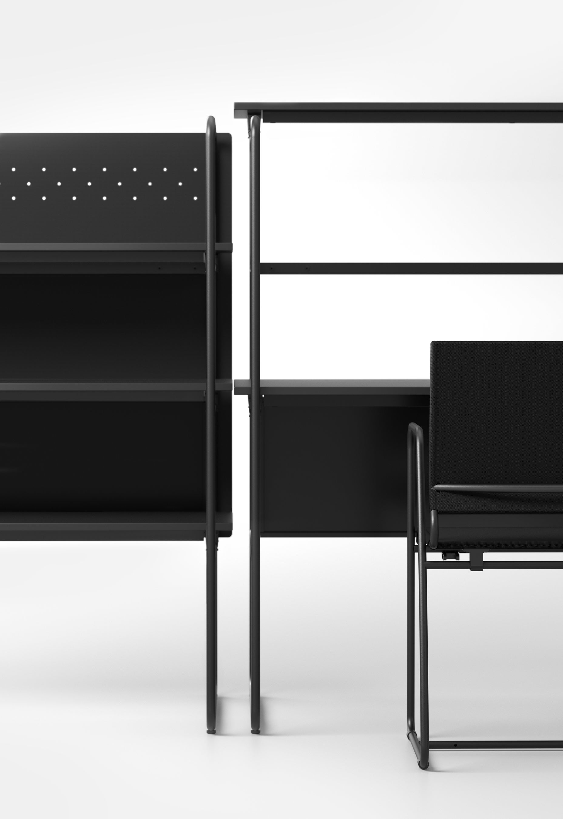 シェルフは天板や棚板の高さを変更可能で、デスク、ハイデスク、シェルフと用途に応じて変えることができます。デスクとして使用する際はフレームが目線に近い高さにあることで仕切りとなり、集中しやすいワークスペースが作れます。