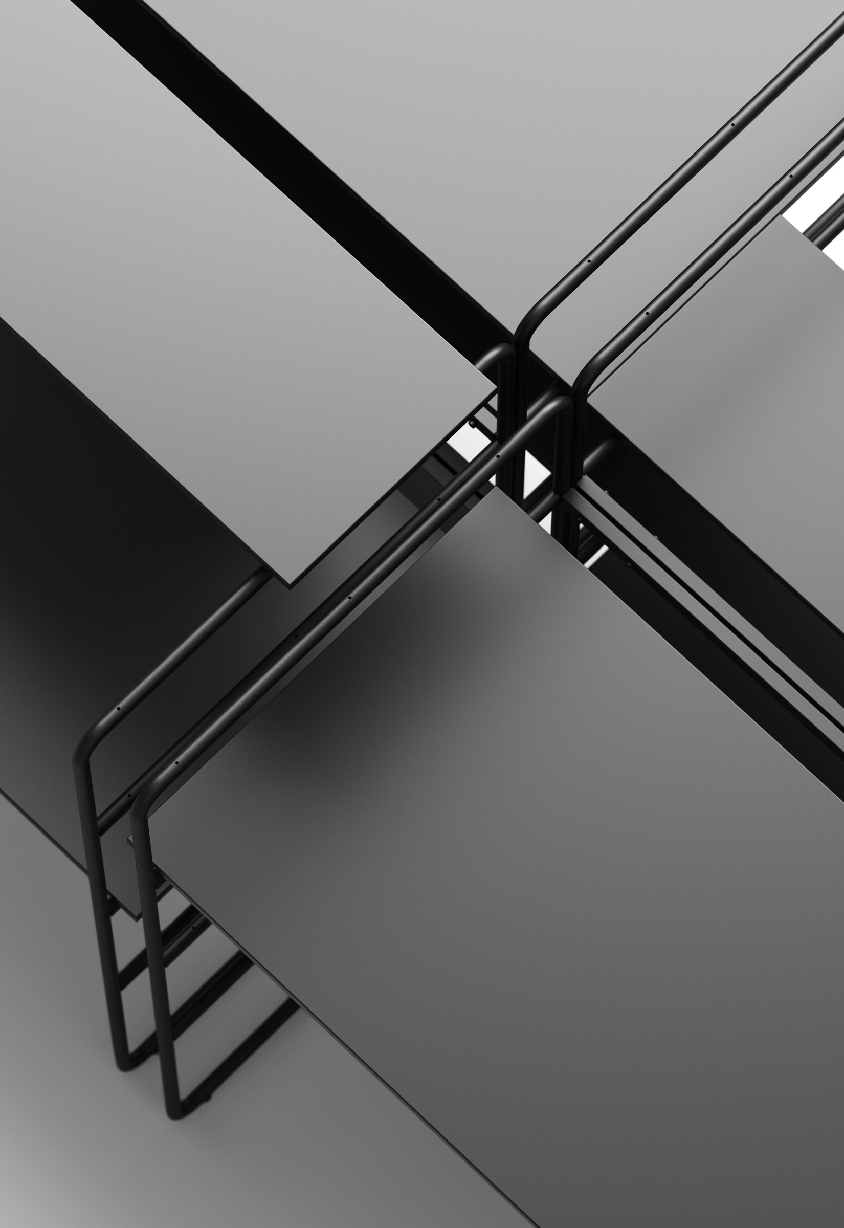 天板とフレームの間には隙間があり、配線を収納したり、オプションのモニタースタンドを取り付けたりすることも可能です。棚板は横に並べると隙間なく合わせるので、隣合う空間や人をシームレスに繋ぎます。