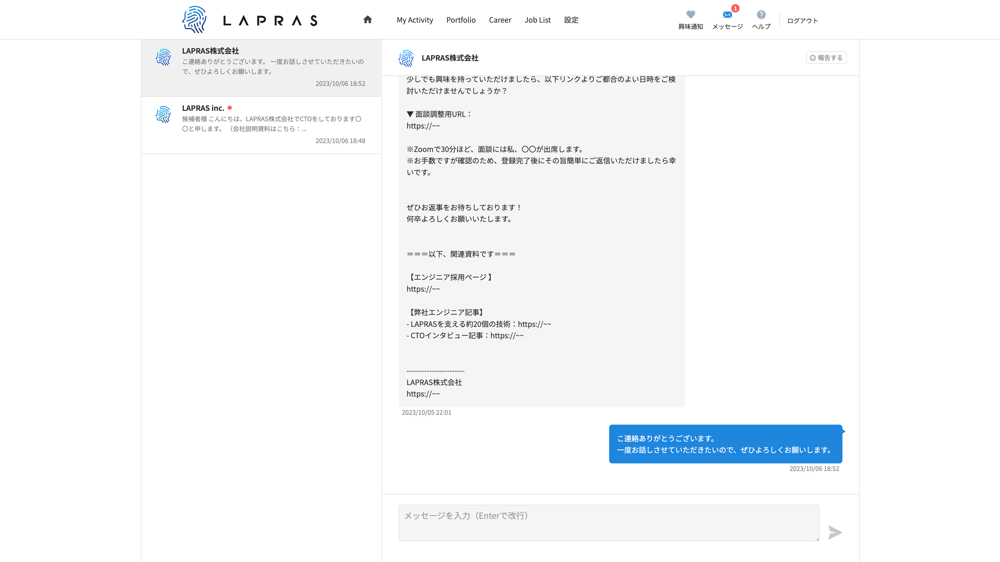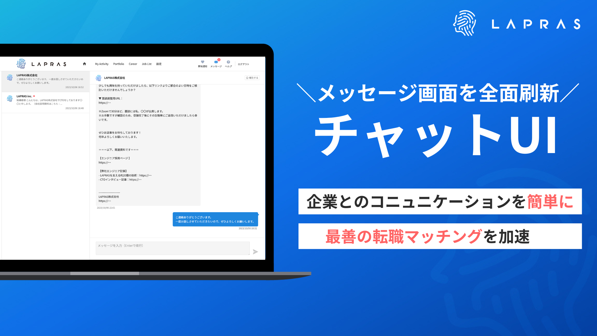 スカウトされた企業とのコミュニケーションをチャット形式で簡単に。エンジニアのキャリアパートナー「LAPRAS」のメッセージ画面を全面刷新