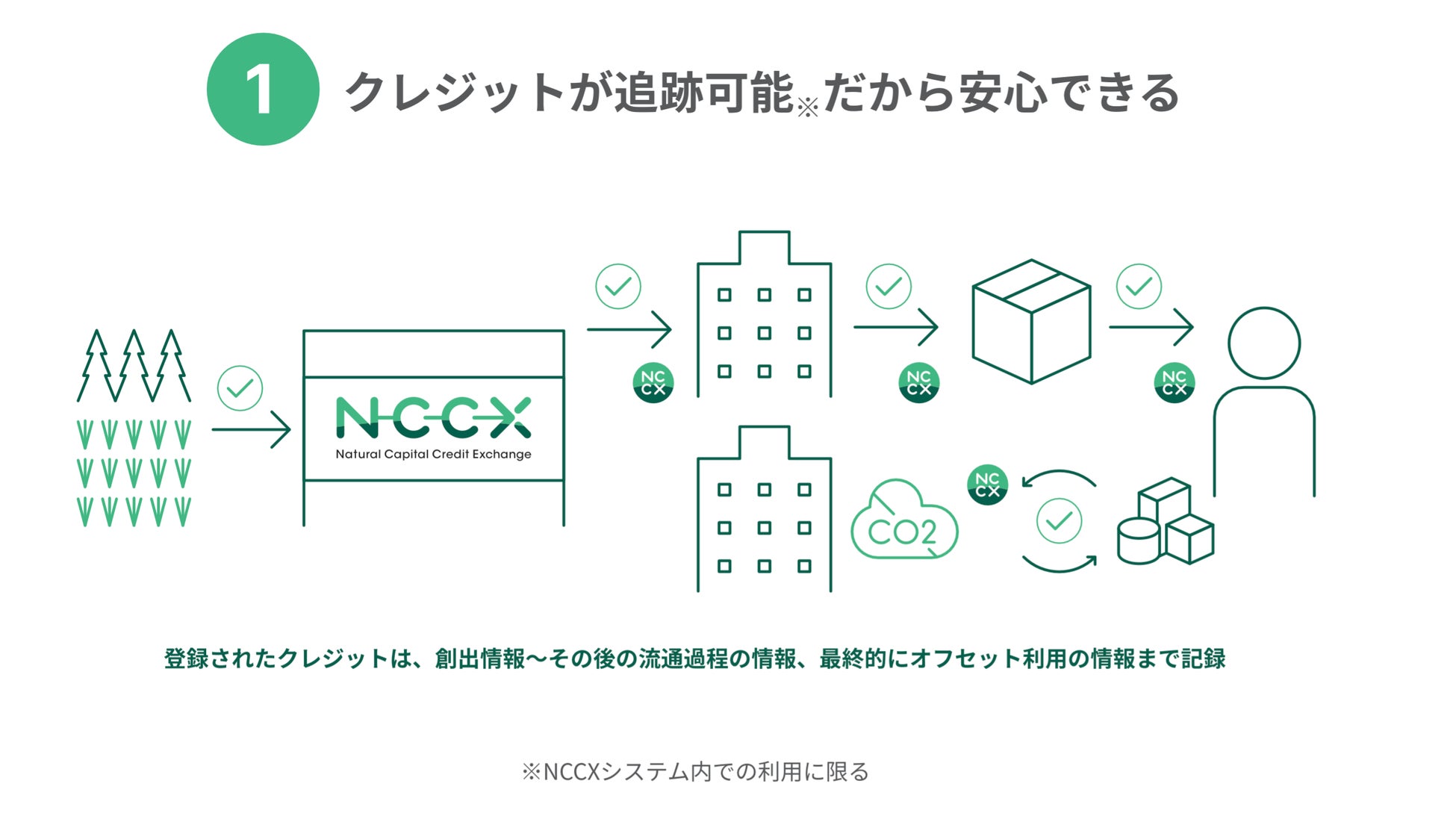 本取引所ではブロックチェーン技術を活用することで、データの改竄や二重計上などの諸課題を解決し、クレジット取引の迅速化・効率化を目指しています。これにより、NCCCで創出される信頼性の高いボランタリークレジットや、既に市場に流通しているJ-クレジットといった各種カーボンクレジットを、これまでの法人間の取り引きに留まらず、一般消費者に向けて流通する事で、消費者参加型の環境対策を実現します。
