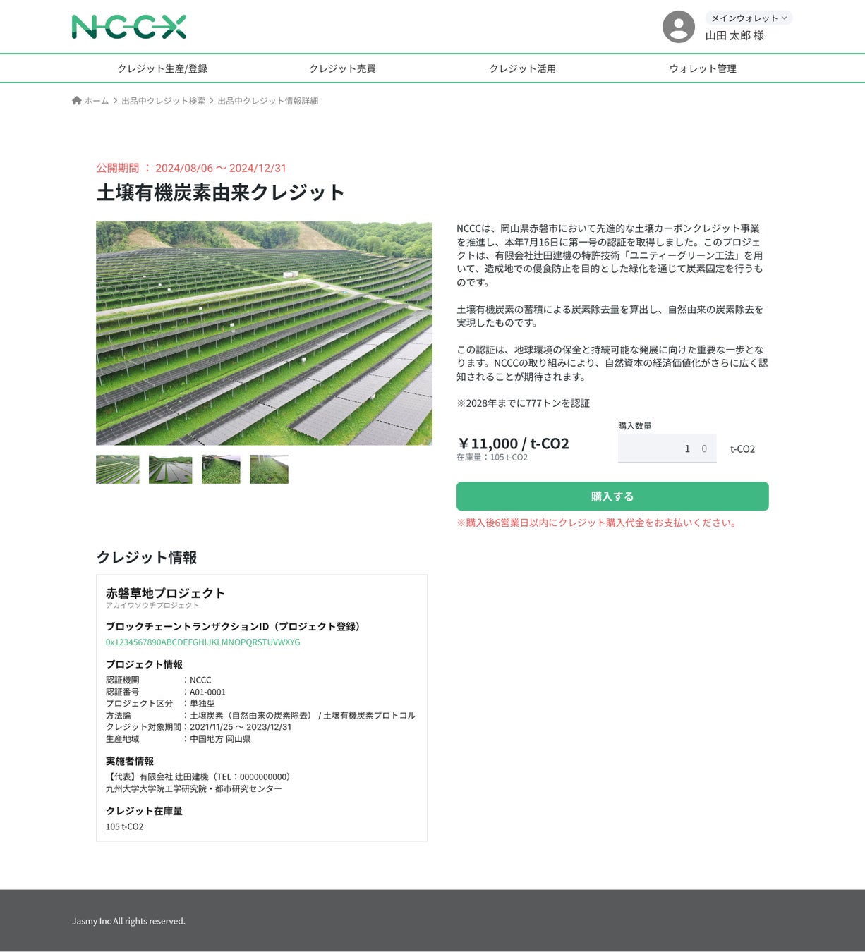 NCCCは、岡山県赤磐市における土壌カーボンクレジット事業に関して、本年7月16日に第一号の認証を行いました。同事業は、造成などにおける侵食を防止する工法として、有限会社辻田建機が特許取得しているユニティーグリーン工法による土壌の緑化を通じて炭素固定を行うものです。これは、地球環境の保全と持続可能な発展に向けた重要な一歩であり、今回の認証取得により、NCCCによる自然資本の経済価値化の試みがさらに広く認知されることを期待しております。今後もNCCCによって認証・創出された高品質なカーボンクレジットは、本取引所を介して引き続き国内販売を行っていく予定です。