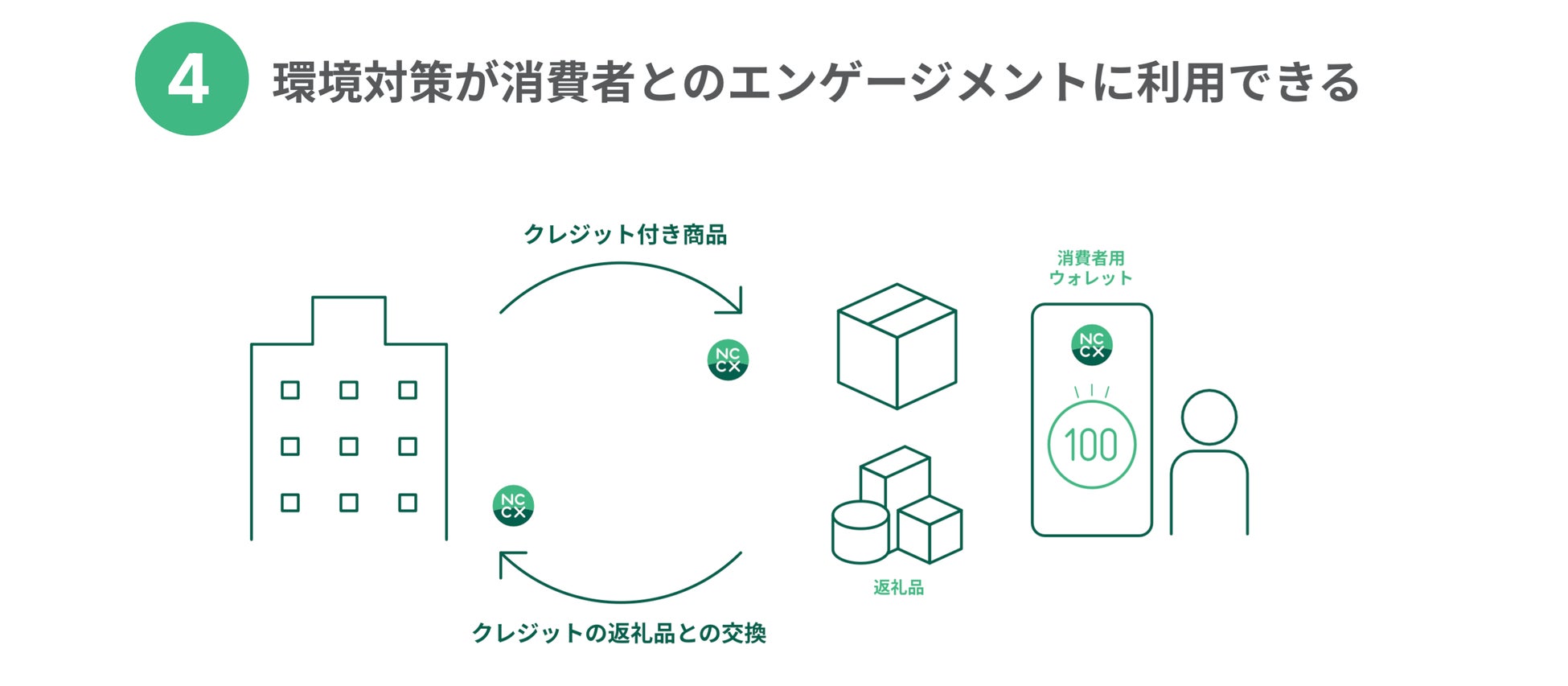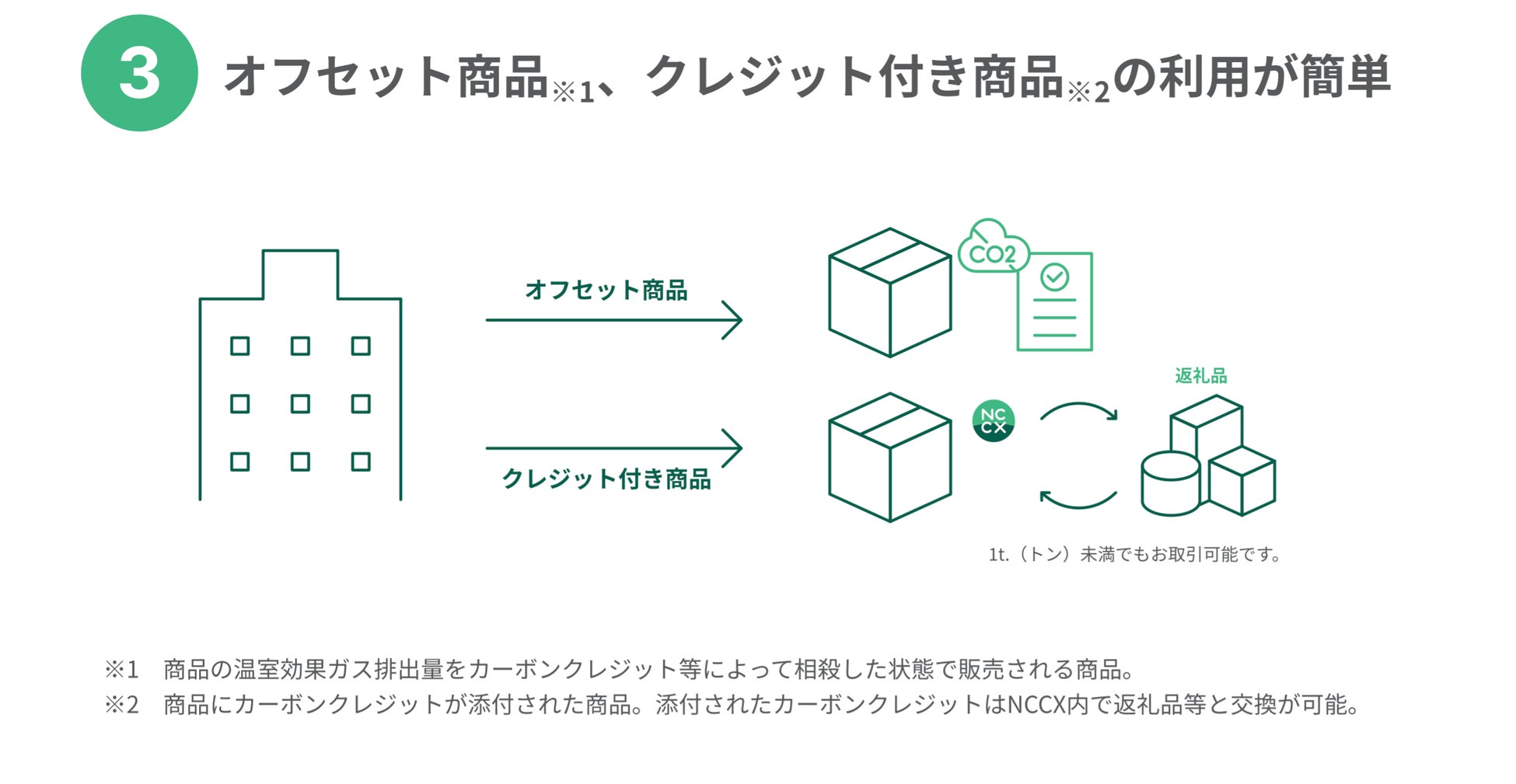 商品を受け取った消費者は、個人としてカーボンクレジットをオフセット利用したり、企業や地域と連携した取り組みにカーボンクレジットを介して参画する事が可能となります。