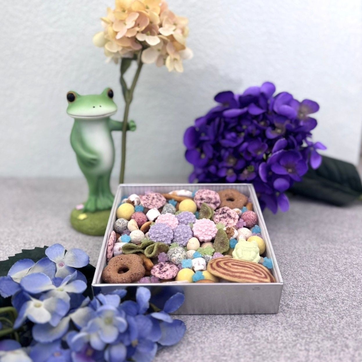 ピンクと紫に咲くあじさいと、かわいい蛙は和三盆。サクサクした食感が楽しい抹茶のおせんべいはあじさいの葉っぱのよう。