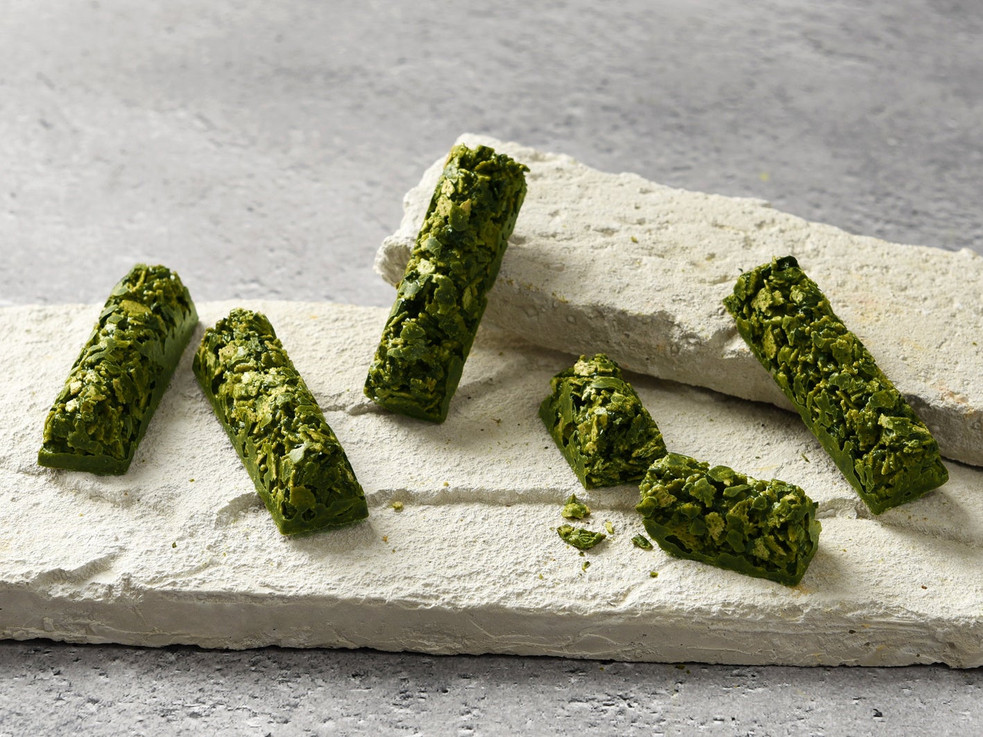 まろやかな旨味の碾茶とフィアンティーヌ(薄焼きクッキーのフレーク)のサクッとした食感が楽しい抹茶クランチショコラです。