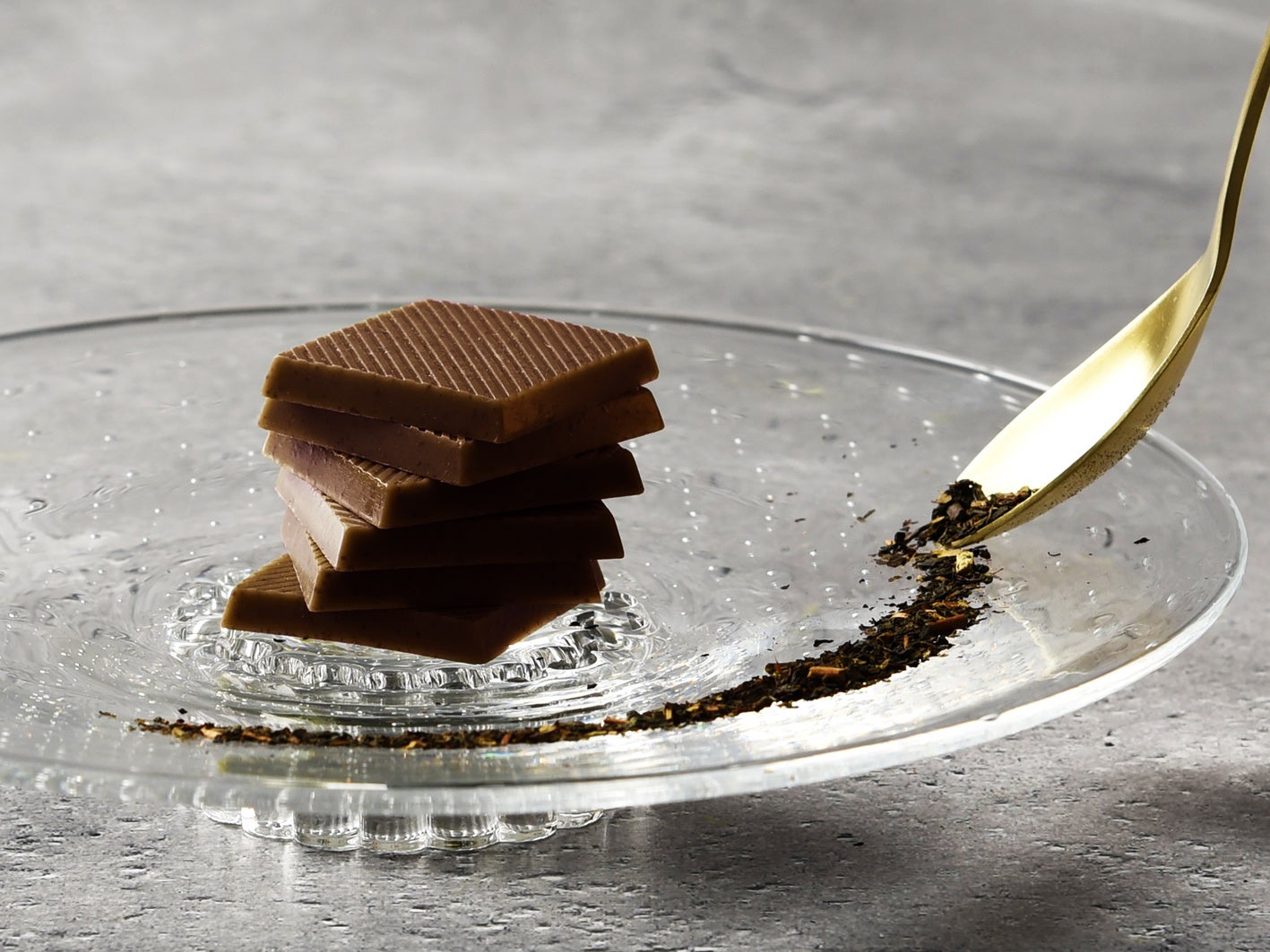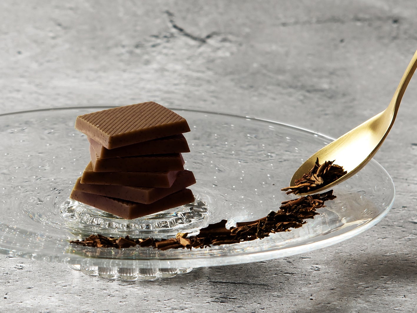 和紅茶の優しい渋味、ホワイトチョコレートのまろやかな甘味、そしてサクサクとした食感が楽しめるほうじ茶の葉をバランス良く合わせました。