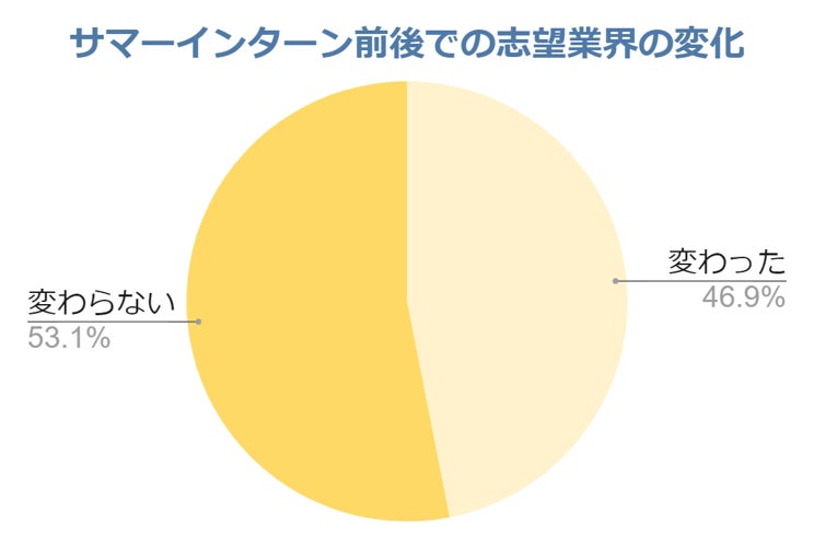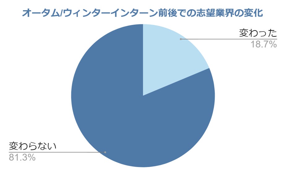 オータム/ウィンターインターンを経て志望業界の変化があったかを聞くと、「変わった」と答えたのは2割に及びませんでした。サマーインターン後のアンケート(※1)では半数近くが志望業界に変化があったことを考えると、学生の態度変容を促すには早い時期からのアプローチが必要と言えるでしょう。