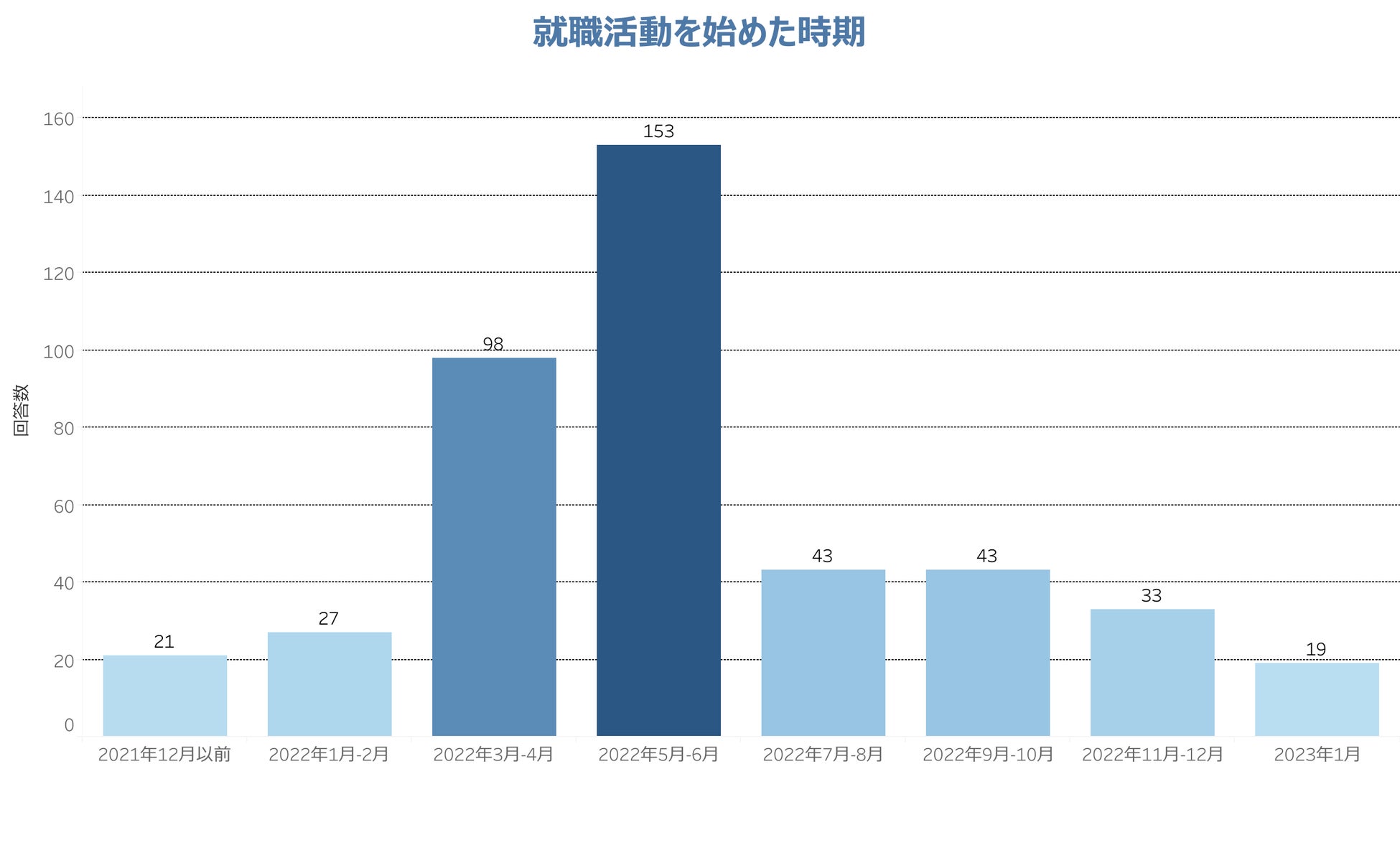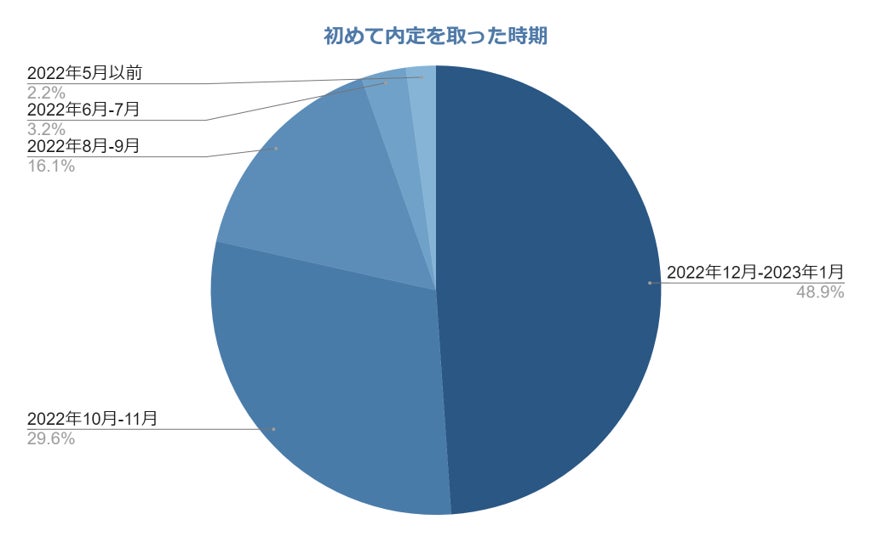 約半数は年末から年始にかけて内定を獲得しています。次に多いのは2022年10月-11月(29.6%)ですが、これはサマーインターンを経て内定を出す企業が増えていることに影響されていると言えるでしょう。
