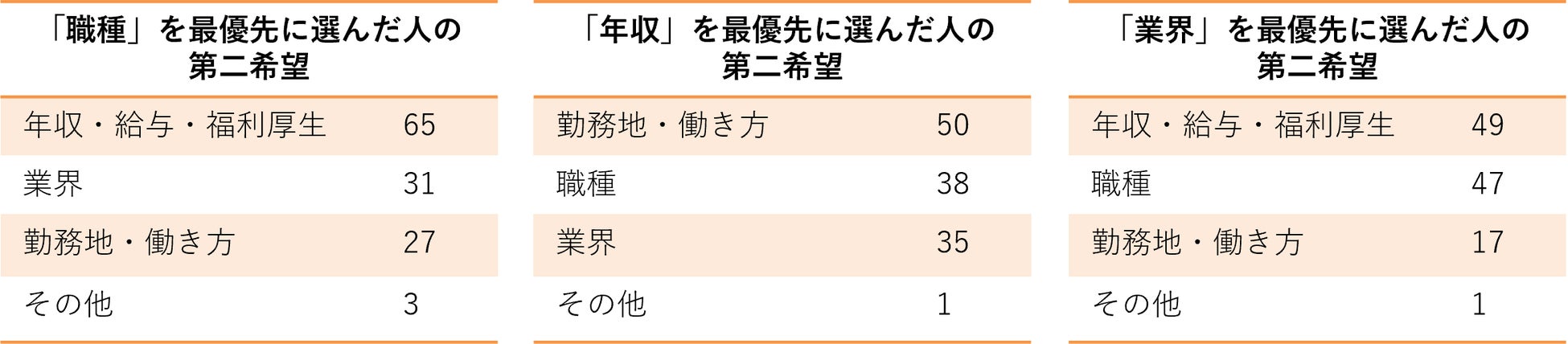さらに、最優先に「職種」を選んだ人が次に重視するのは年収→業界、「年収」を選んだ人は勤務地→職種、「業界」を選んだ人は年収と職種がほぼ同値という結果が出ています。
