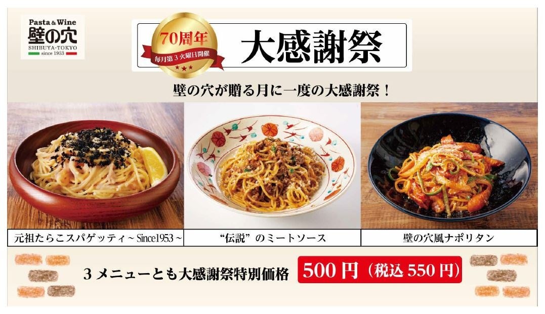 創業70 周年!お客様が「メニュー・プロデューサー」。和風スパゲティの元祖「壁の穴」より、秋のおすすめメニューが登場!