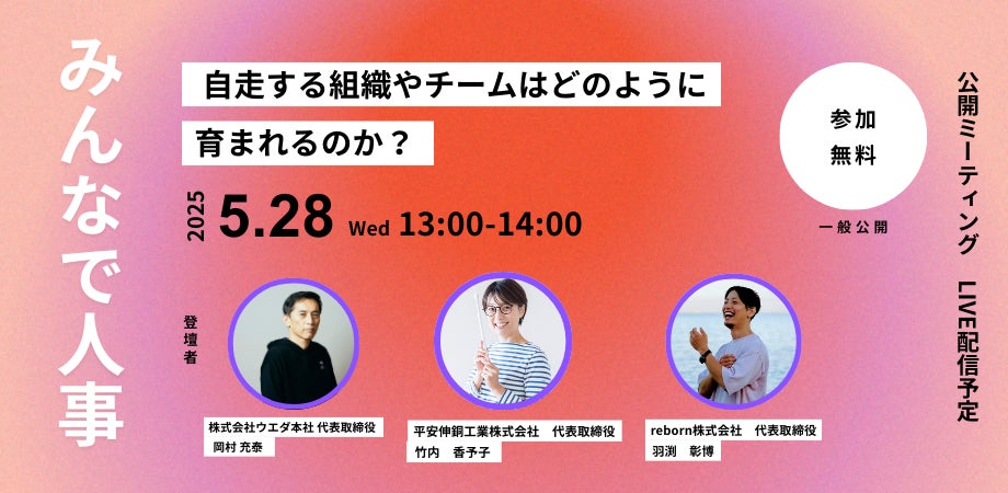 株式会社ウエダ本社(所在地:京都府京都市、代表取締役:岡村充泰)、平安伸銅工業株式会社(所在地:大阪府大阪市、代表取締役:竹内香予子)およびreborn株式会社(所在地:神奈川県逗子市、代表取締役:羽渕彰博)は、中小企業の経営者が抱える人材・組織課題を、みんなでシェアし、相互に解決しあうための新たなオンラインコミュニティ「みんなで人事」を立ち上げます。