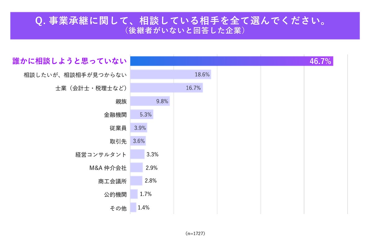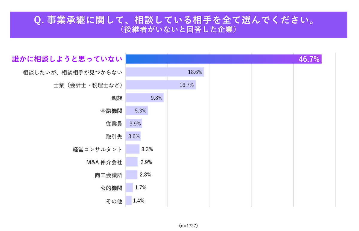 4)後継者候補がいないと回答した企業の約半数が、事業承継に関して「誰かに相談しようと思っていない」という状況が明らかに。一方で、「誰かに相談したいが相談相手が見つからない」と回答した企業が約2割を占め、事業承継への当事者意識を高めるだけでなく事業承継の相談窓口をさらに拡充していくことが必要