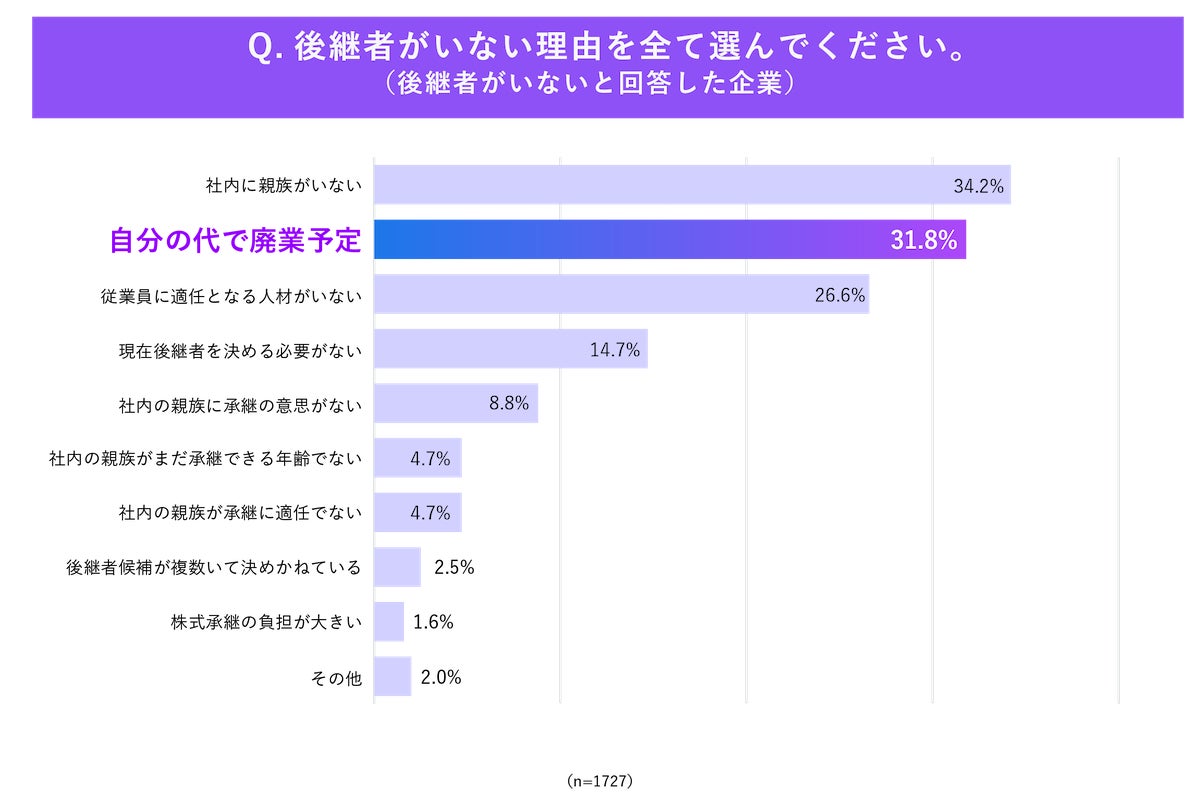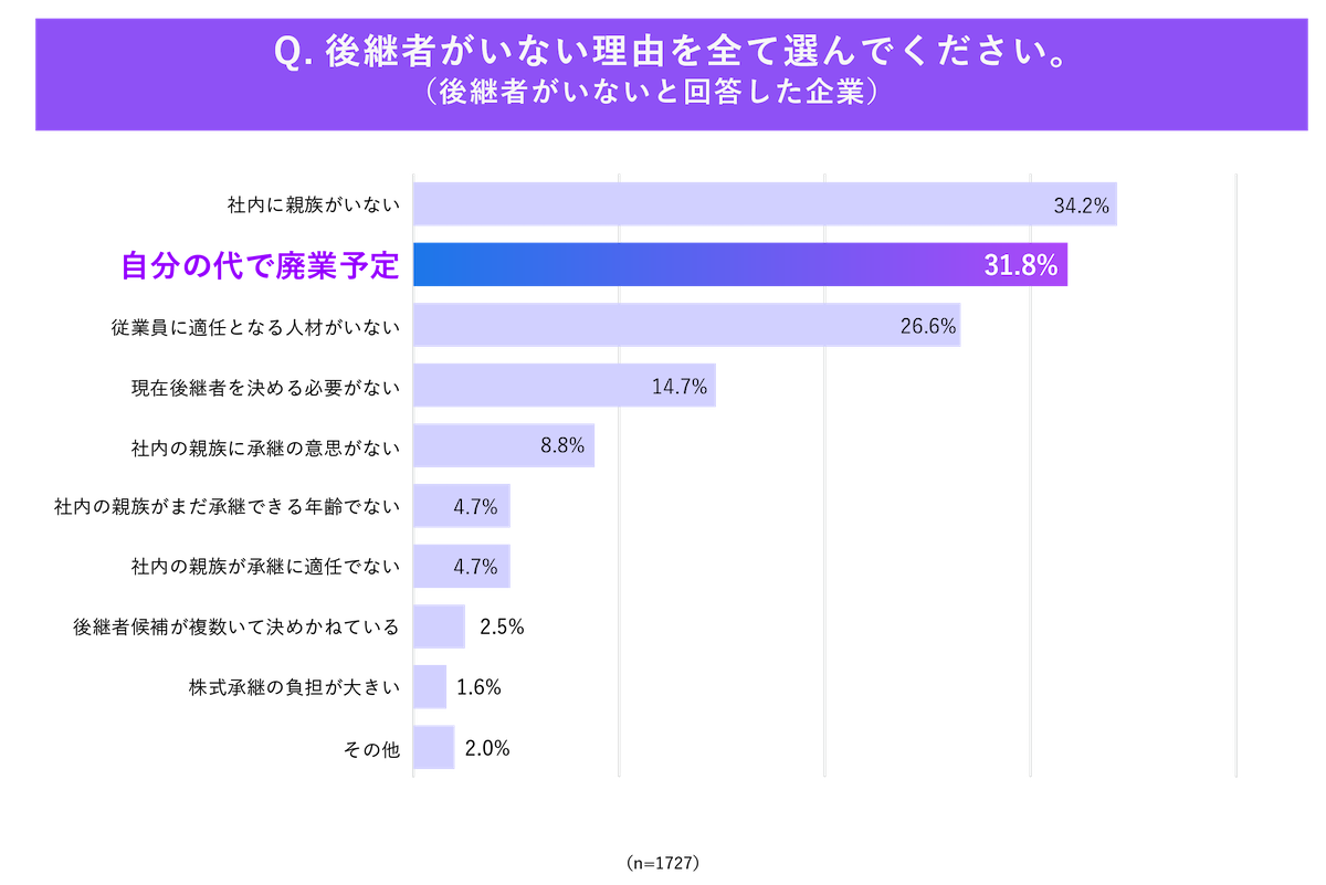 後継者候補がいない理由として「自分の代で廃業予定(31.8%)」と回答した企業の割合は特に高く、この状態が続けば、企業の減少による技術や雇用の喪失といった経済に対するマイナスの影響を及ぼすことが考えられます。
