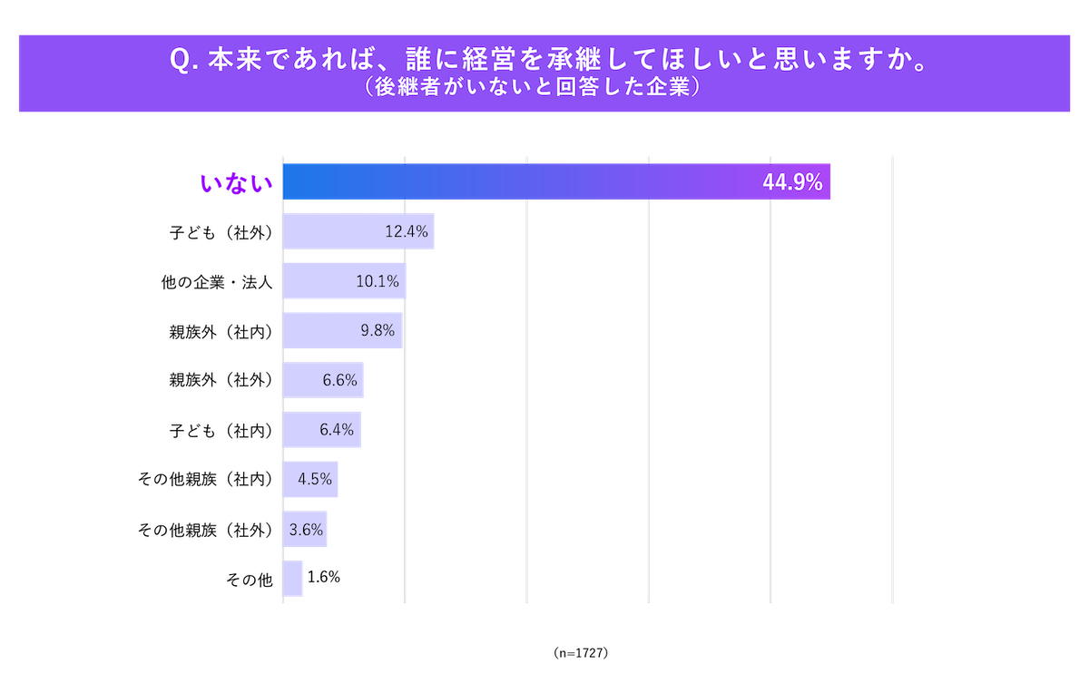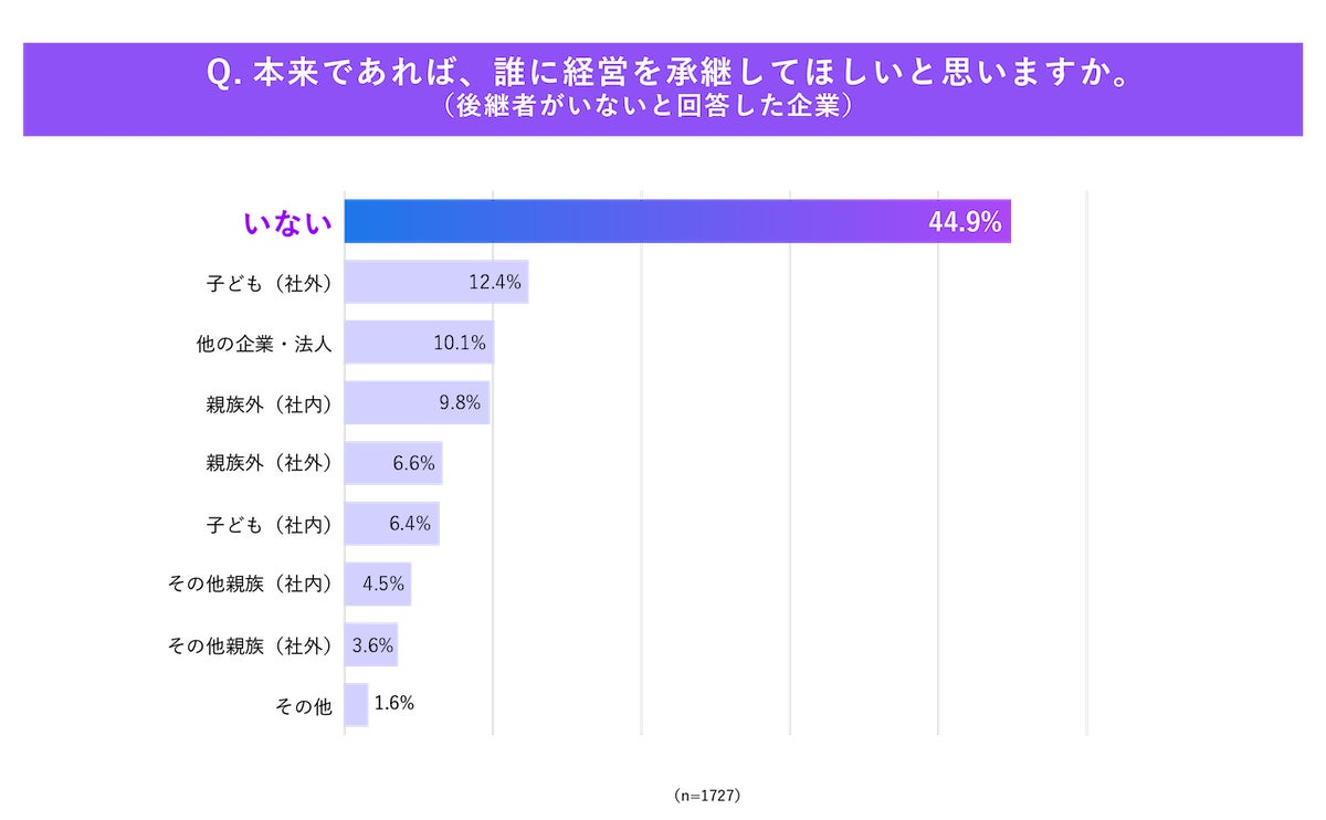 後継者候補がいないと回答した企業のなかで、本来会社を継いでほしい相手は「いない(44.9%)」と回答した企業の割合が最も高く、約半数を占めました。後継者候補がいない状態になると事業承継への意識が薄まってしまうことがうかがえ、後継者がいなくとも事業承継に対する意識を高めていくことが必要であることが考えられます。