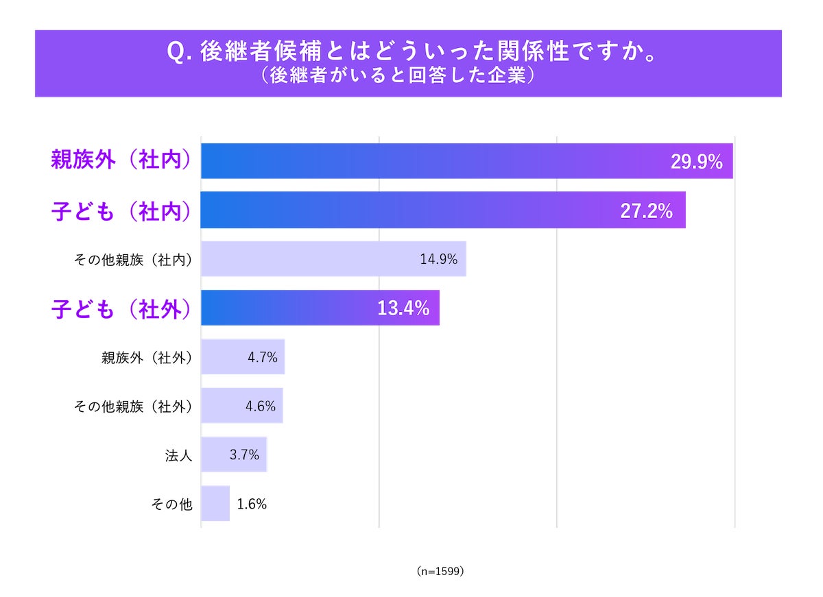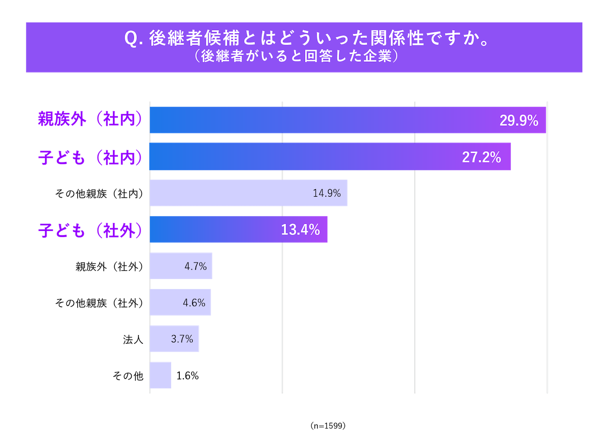 後継者候補との関係性は、全体で「社内に所属する親族外(従業員)(29.9%)」「社内に在籍する子ども(27.2%)」がそれぞれ約3割を占める結果となりました。子どもへの承継に関しては、社内に在籍していない子どもへの承継を検討している企業の割合と合わせると約4割を占め、経営者自身との関係性においては子どもへの承継を行う傾向がみられます。