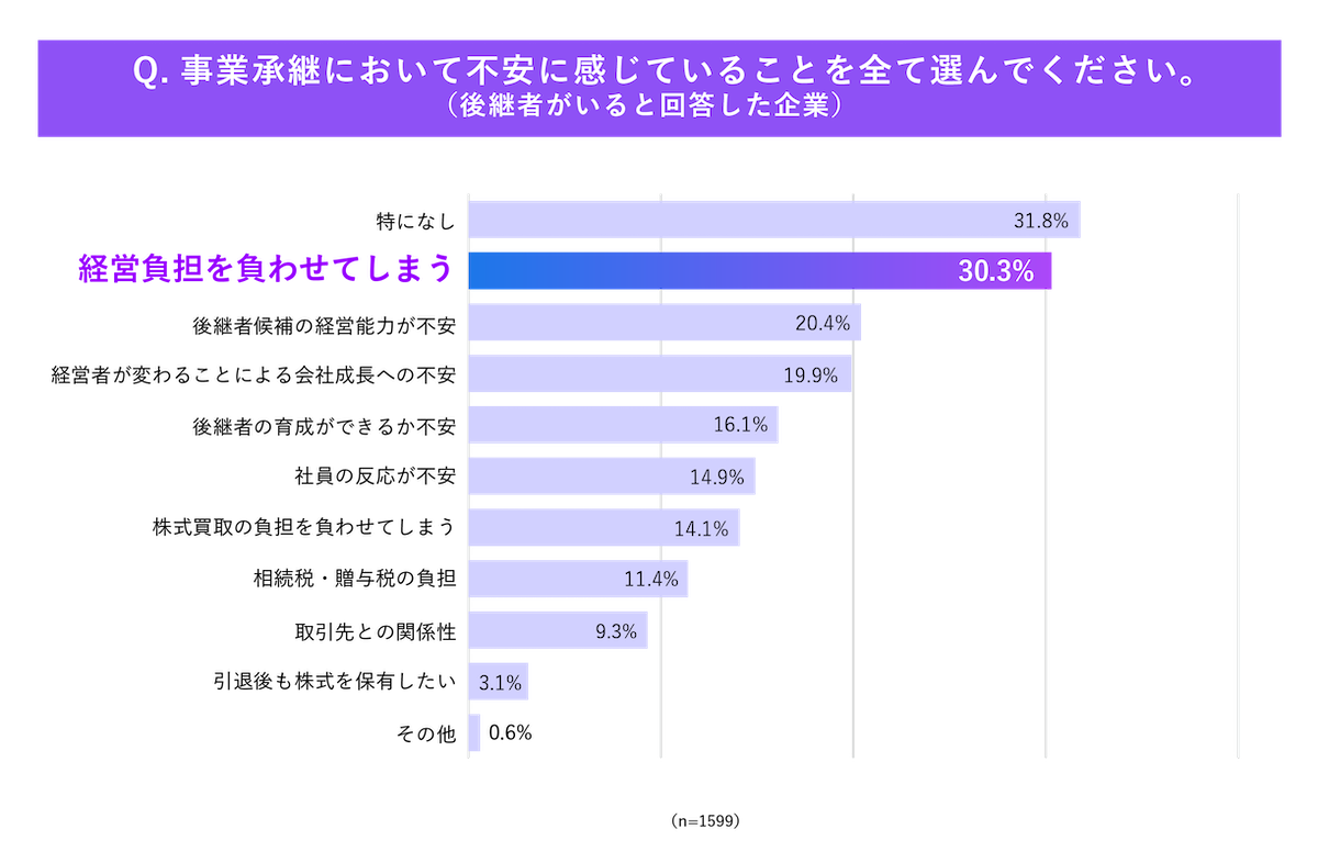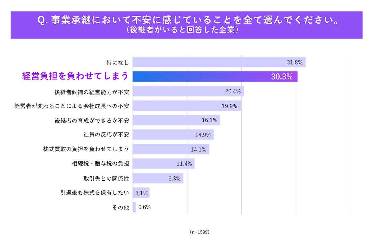 後継者候補がいる企業のなかで、事業承継に対する不安として後継者候補に「経営負担を負わせてしまうこと(30.3%)」を挙げる企業の割合が最も高い結果となり、後継者の経営負担軽減も事業承継における課題となっていることがうかがえます。