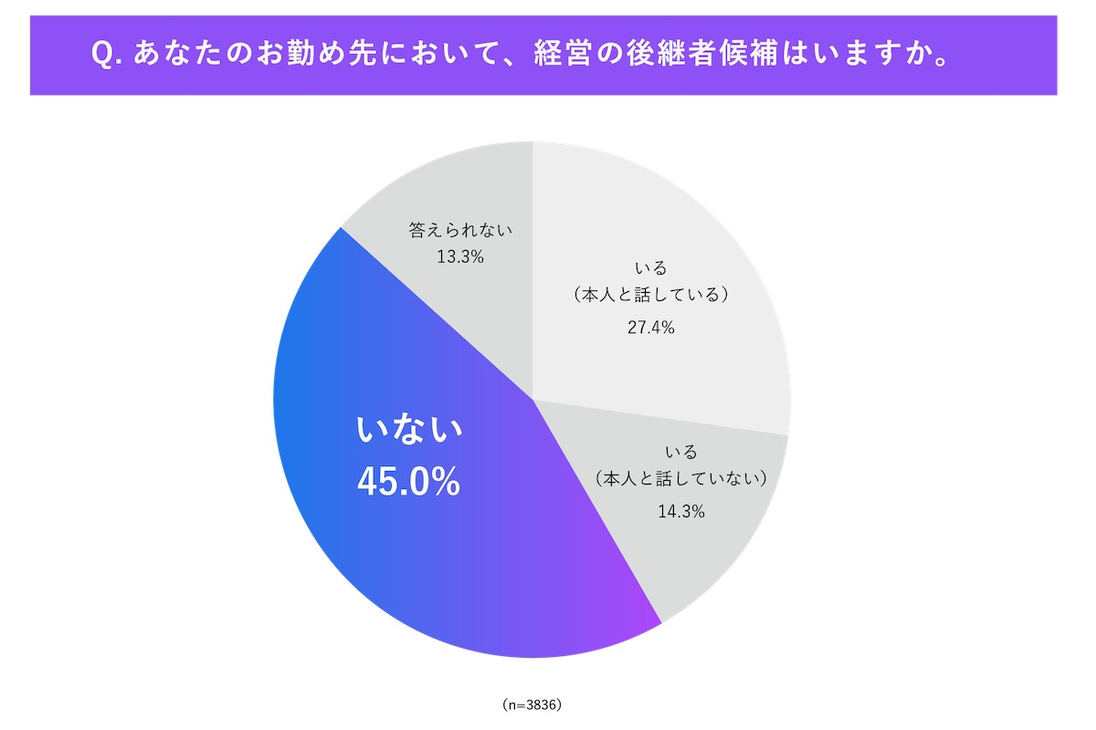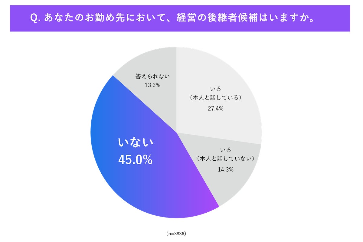 全体で「後継者候補がいない(45.0%)」と回答した企業の割合は約半数を占めており、後継者不在の状況が深刻であることがうかがえます。