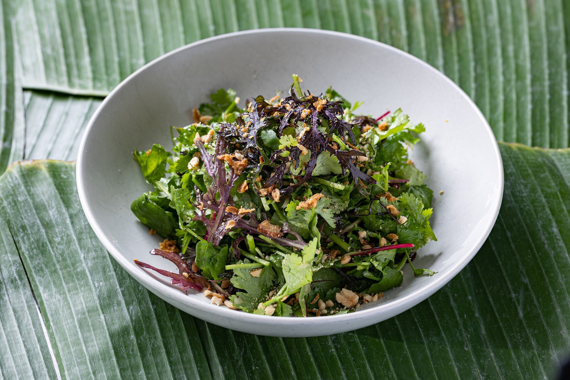 トッピングしたフライドオニオンとピーナッツが味のアクセント。トマトリーフの爽やかな酸味とクレソンの苦みが、春らしさを演出してくれます。