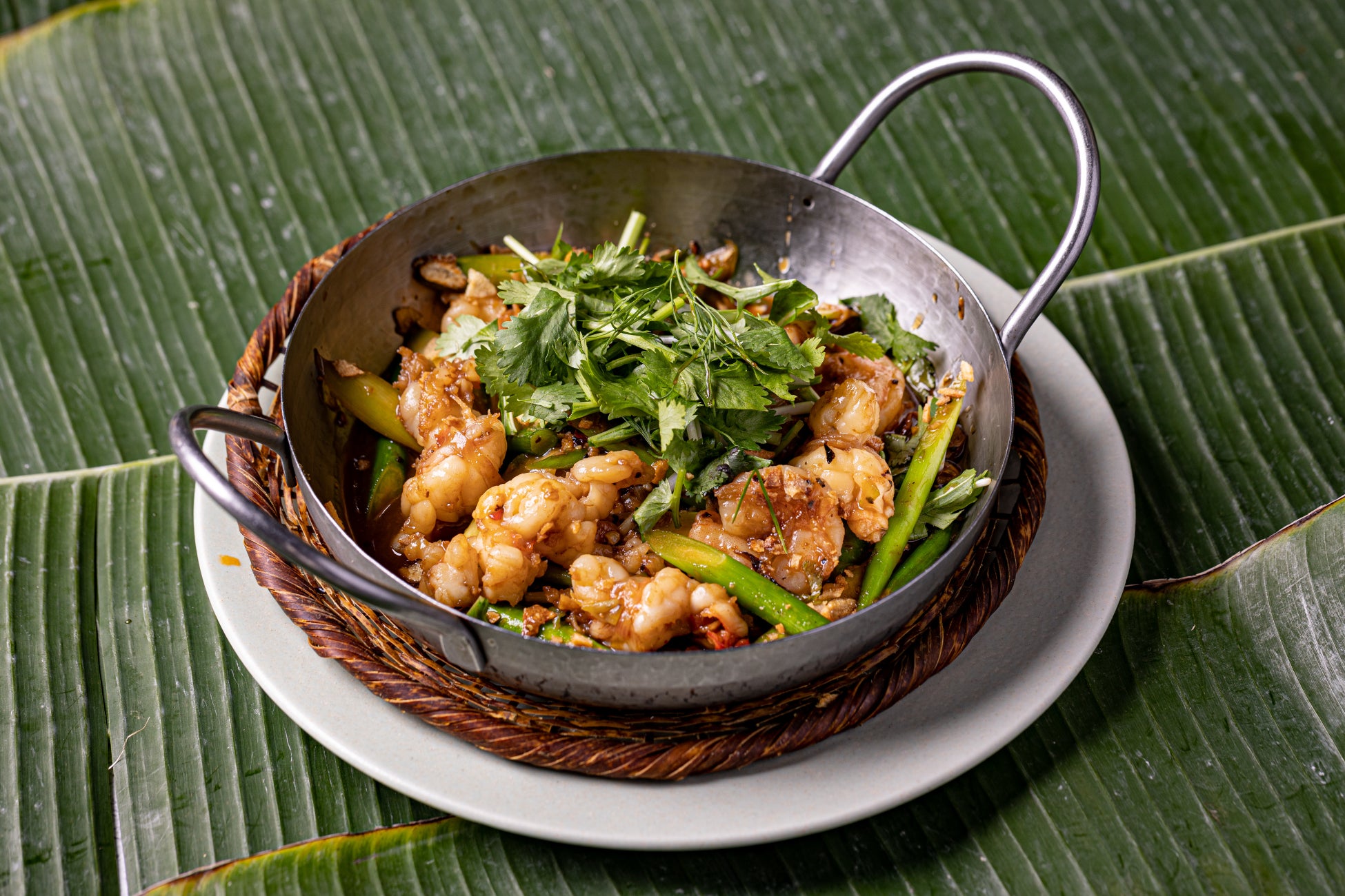 運ばれてきた瞬間、ついついごはんを注文したくなるような食欲をそそるニンニクの香り。そして、レモングラスの爽やかな香りが押し寄せてきます。香り高い油を纏ったソフトシェルシュリンプは、海老の旨味を頭から尻尾まで丸ごと味わえます。パリッと音がするぐらい新鮮なマーメラスを使うことで食感が豊かに、そして、混ぜるごとにしんなりと甘みを増していくフライドオニオンが味に広がりを持たせてくれます。これからの季節にぴったりのエスニック料理です。