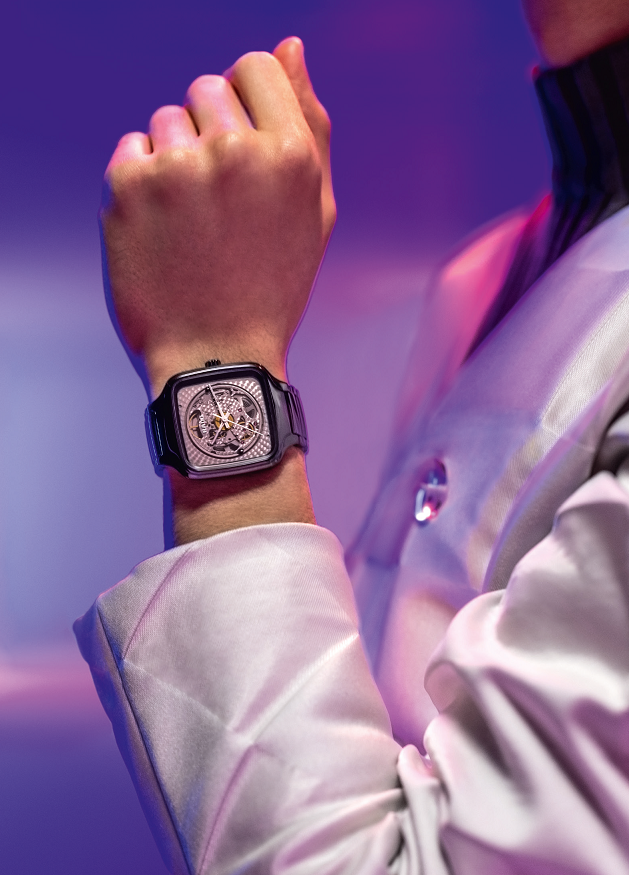 トゥルー スクエア x 森永邦彦は、チタン製の 3 つ折りクラスプで固定されたポリッシュされたブラックのハイテク セラミック ブレスレットで表現されています。この時計は 5 気圧 (50 メートル) の防水性を備えており、スペシャルエディションカードが付属しています。
