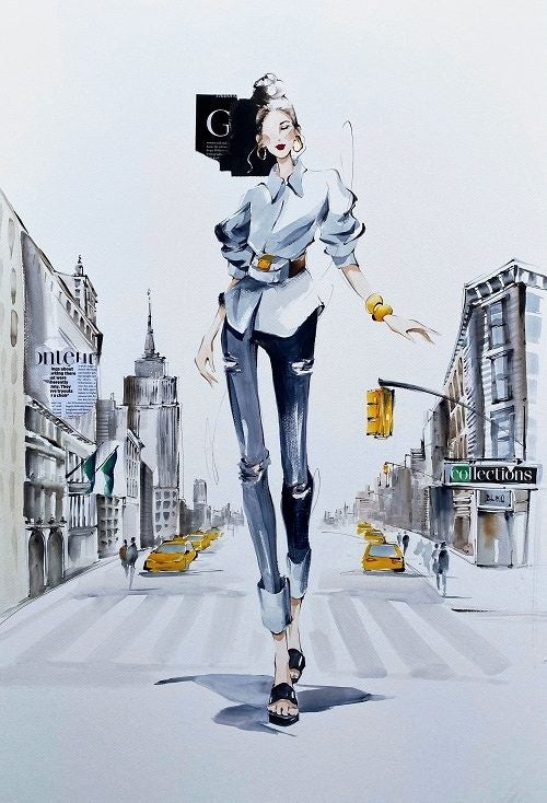ダイナミックな筆致と余白を活かした構図で人物、風景、ファッションアイテムなどを大胆に描写する作品を得意とする。