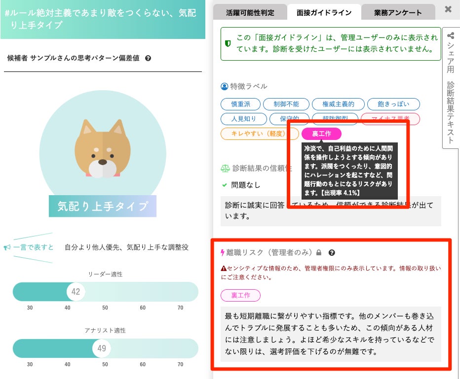本機能は、Jobgram適性検査に蓄積された数十万人のデータと応用心理学の研究成果を活用し、離職や組織トラブルを引き起こす可能性のある特性を表示します。
