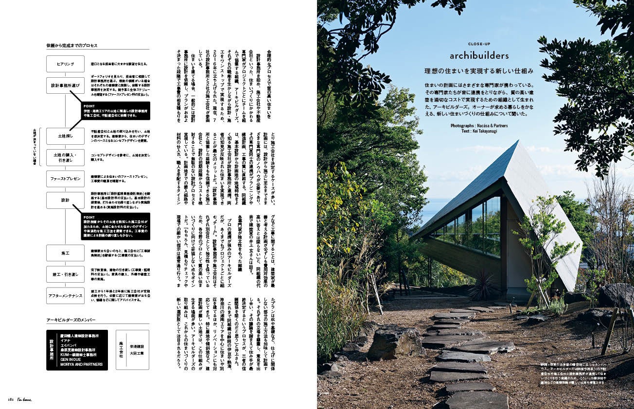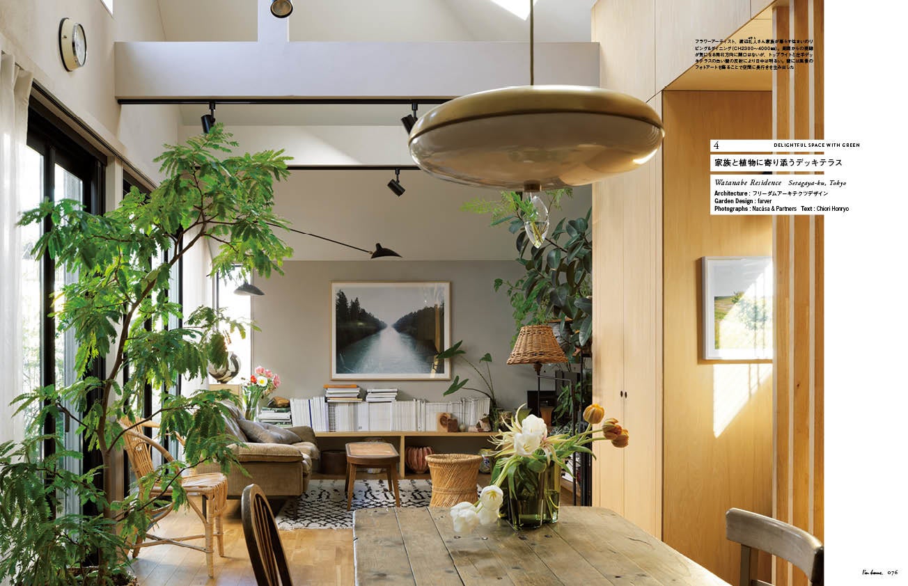 住まいに彩りを添える植物。季節と共に移ろう庭の景色を眺めたり、花や草木に囲まれて食事をしたりと、植物の楽しみ方は十人十色です。今号は、「植物を愉しむ住まいのつくり方」を特集し、緑豊かな8軒の住宅を始め、街と住まいをつなぐアプローチのデザインや鉢植えのコーディネートを解説。庭で活躍するアウトドアアイテムやボタニカルショップなどを紹介します。