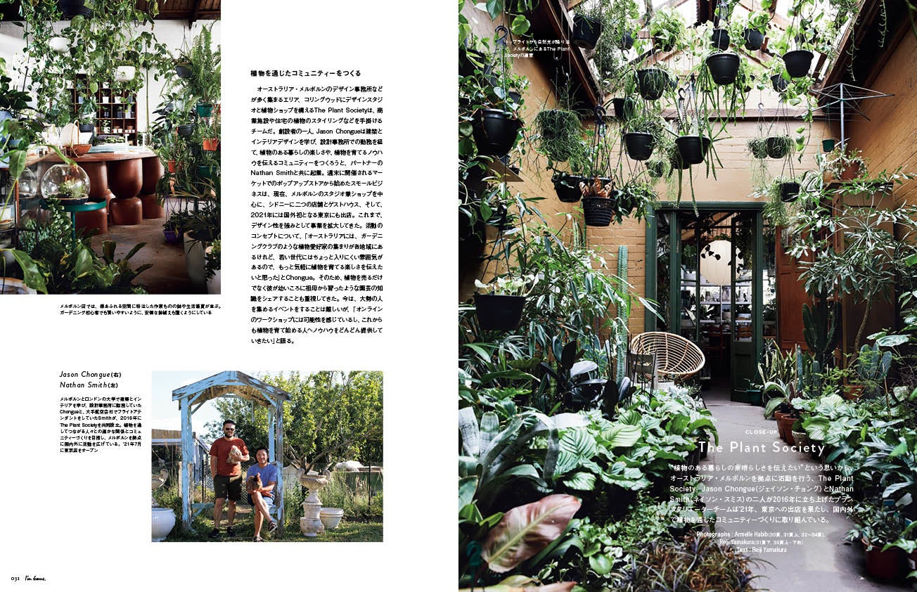 “植物のある暮らしの素晴らしさを伝えたい”という思いから、オーストラリア・メルボルンを拠点に活動を行う、The Plant Society。Jason Chongue(ジェイソン・チョング)とNathan Smith(ネイソン・スミス)の二人が2016年に立ち上げたプランツクリエーターチームは'21年、東京への出店を果たし、国内外で植物を通じたコミュニティーづくりに取り組んでいます。